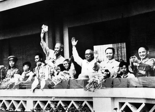 Bác Hồ và đoàn chủ tịch chào đón các đoàn đi qua lễ đài trong Lễ duyệt binh chào mừng kỷ niệm 10 năm Ngày Quốc khánh (2/9/1955) trên quảng trường Ba Đình (Hà Nội). Ảnh tư liệu TTXVN