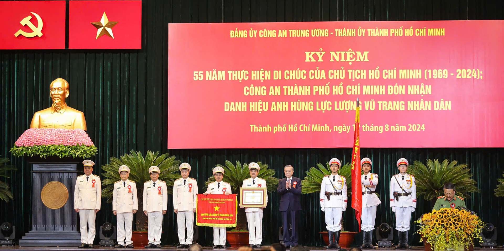 Tổng bí thư Tô Lâm dự lễ Kỷ niệm 55 năm Thực hiện Di chúc Chủ tịch Hồ Chí Minh và Công an Thành phố Hồ Chí Minh đón nhận Danh hiệu Anh hùng lực lượng vũ trang nhân dân.