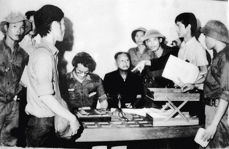 Tổ điệp báo An ninh T4 tham gia áp giải, buộc Tổng thống chính quyền Sài Gòn Dương Văn Minh đến Đài phát thanh tuyên bố đầu hàng vô điều kiện. (Ảnh: Công an Thành phố Hồ Chí Minh)