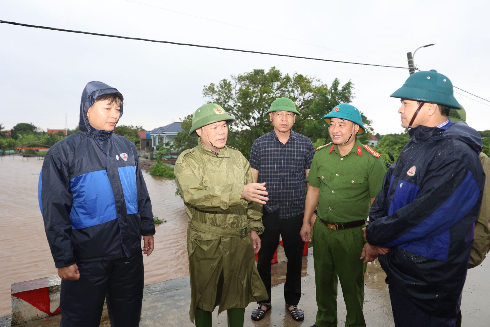 Đồng chí Thiếu tướng Nguyễn Hữu Mạnh, Giám đốc Công an tỉnh, Phó Trưởng Ban phòng thủ dân sự tỉnh kiểm tra, động viên các lực lượng tham gia phòng, chống cơn bão số 3.