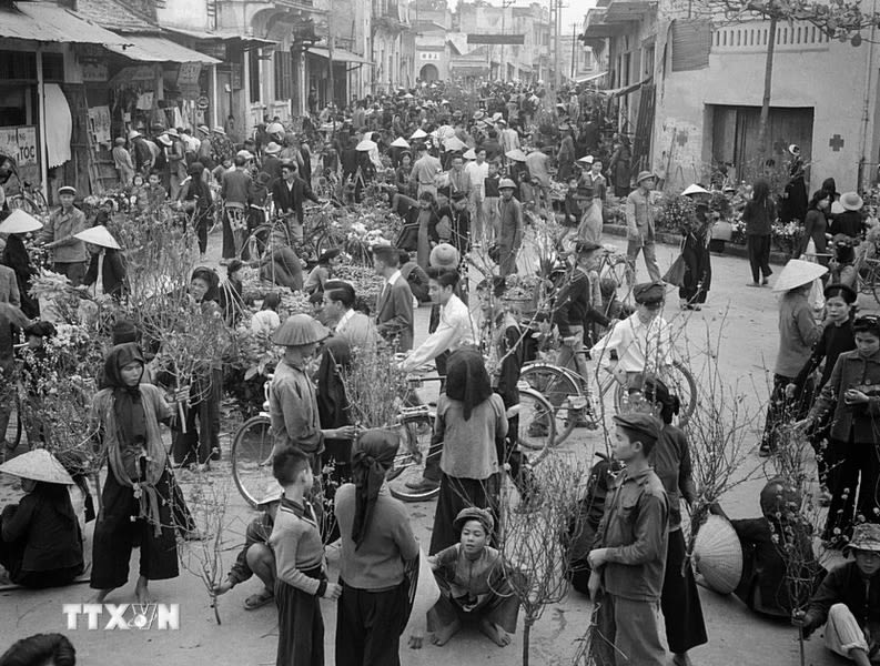 Chợ hoa Hàng Lược (Hà Nội) Tết Bính Thân năm 1956. (Ảnh: TTXVN)