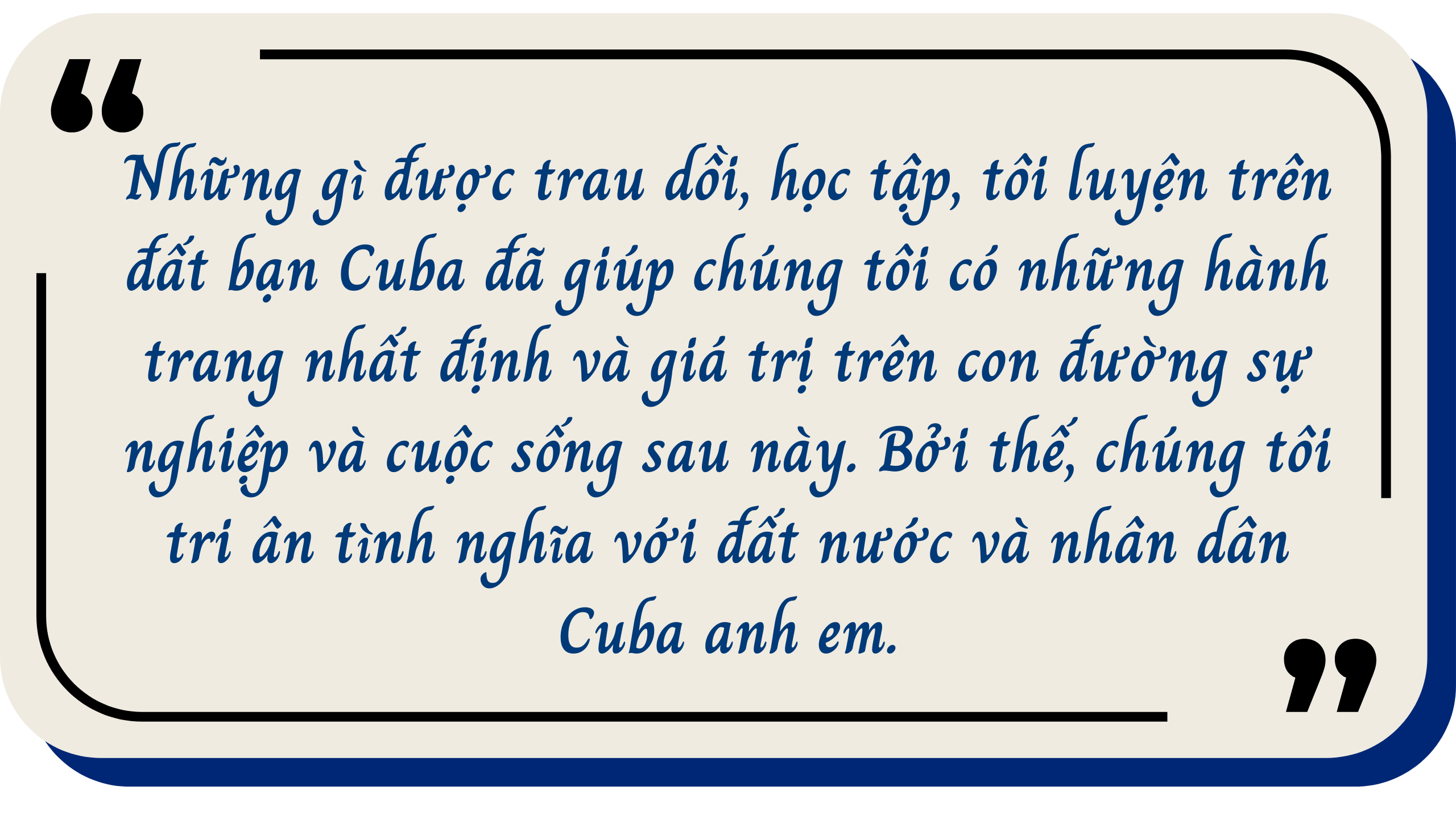 Những gì được trau dồi, học tập, tôi luyện trên đất bạn Cuba đã giúp chúng tôi có những hành trang nhất định và giá trị trên con đường sự nghiệp và cuộc sống sau này. Bởi thế, chúng tôi tri ân tình nghĩa với đất nước và nhân dân Cuba anh em. Trong công việc nói riêng và cuộc sống nói chung của mỗi người, có điều kiện là các cô bác anh chị em đều không tiếc tâm huyết công sức tịnh tài, mong được đóng góp chút gì đó cho đất nước và con người Cuba, trên nhiều phương diện, xuất phát từ trái tim đến với trái tim.