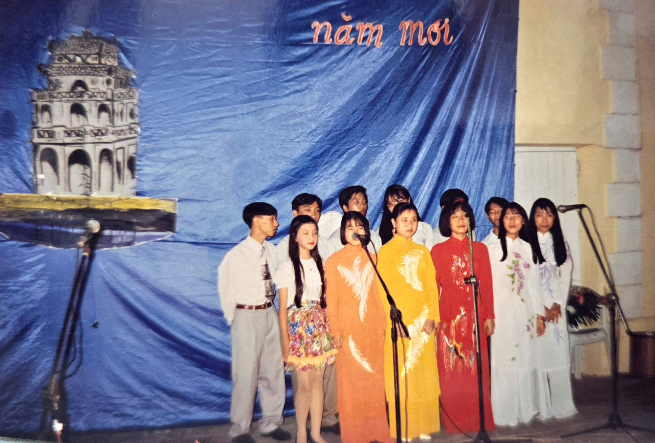 Học sinh, sinh viên Việt Nam tham gia biểu diễn văn nghệ tại Chương trình gặp gỡ cộng đồng người Việt tại Cuba chào đón Tết cổ truyền năm 1998 tại Đại sứ quán Việt Nam tại La Habana. (Ảnh: Nhân vật cung cấp)