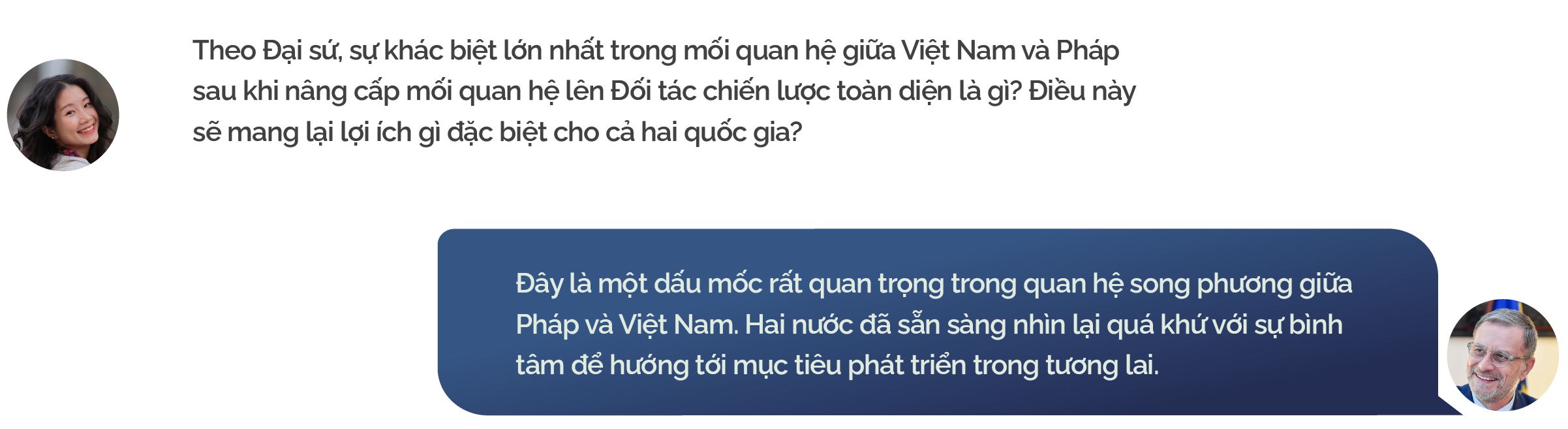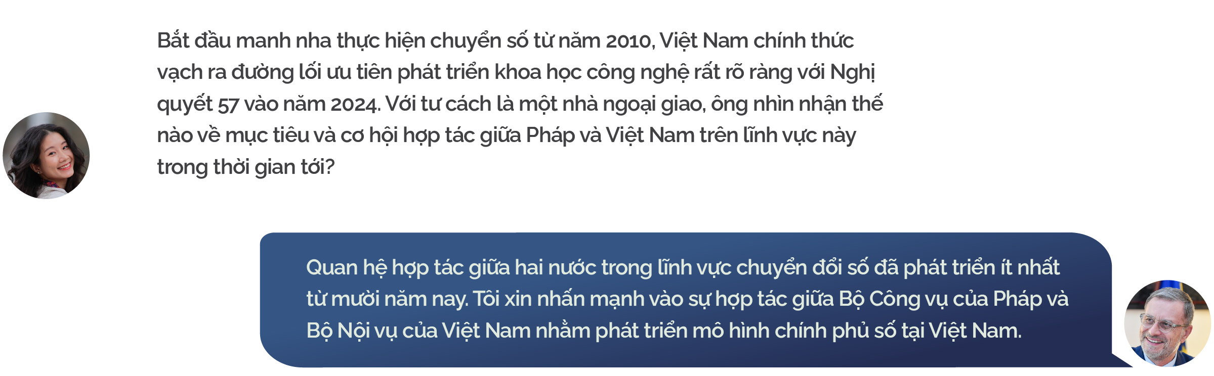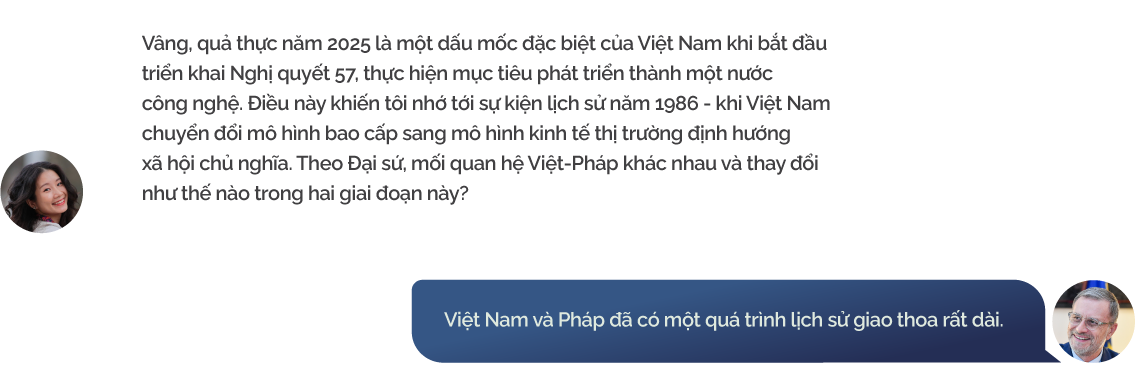 Chúng tôi thấy rõ điều đó qua những mục tiêu mà Tổng Bí thư Tô Lâm đã đặt ra, đặc biệt là mục tiêu đưa Việt Nam trở thành một nước phát triển vào năm 2045. Mục tiêu đó không chỉ đầy tham vọng mà còn rất quan trọng và chính đáng. Pháp tin rằng Việt Nam hoàn toàn có khả năng thực hiện được mục tiêu này. Để đạt được mục tiêu đó, Việt Nam sẽ phải dựa vào thực lực của chính mình, nhưng đồng thời cũng cần có sự hợp tác quốc tế.