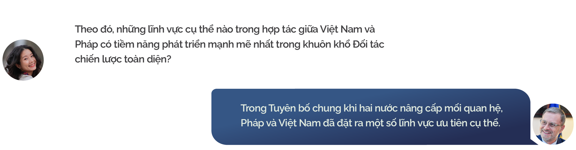Thứ hai, phát triển bền vững: Cả Pháp và Việt Nam đều rất quan tâm đến các vấn đề liên quan đến phát triển bền vững như biến đổi khí hậu, an toàn an ninh mạng,… Do đó, chúng tôi hy vọng hai bên có thể cùng tiến xa trong quá trình hợp tác, tìm ra cách giải quyết những thách thức của thời đại.