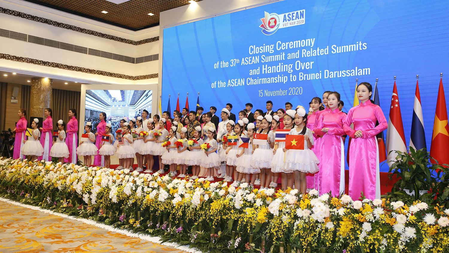 Lễ bế mạc Hội nghị cấp cao ASEAN lần thứ 37 và các hội nghị cấp cao liên quan và chuyển giao vai trò Chủ tịch ASEAN cho Brunei, diễn ra tại Hà Nội, ngày 15/11/2020. Ảnh: TTXVN