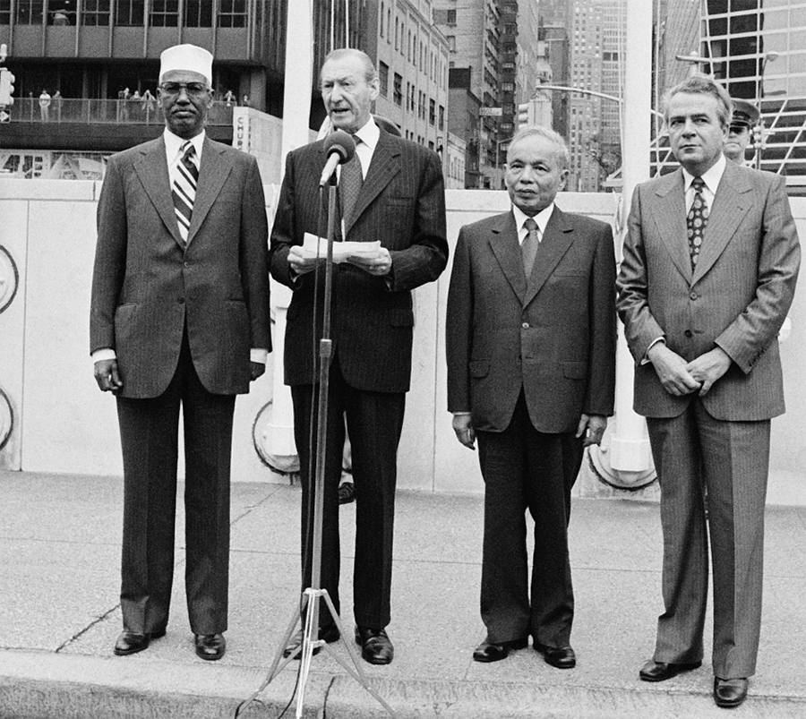 Phó Thủ tướng, Bộ trưởng Ngoại giao Việt Nam Nguyễn Duy Trinh (thứ hai từ bên phải sang) dự lễ kéo cờ Việt Nam tại trụ sở Liên hợp quốc ở New York, Mỹ, ngày 21/9/1977. Ảnh: UN.ORG