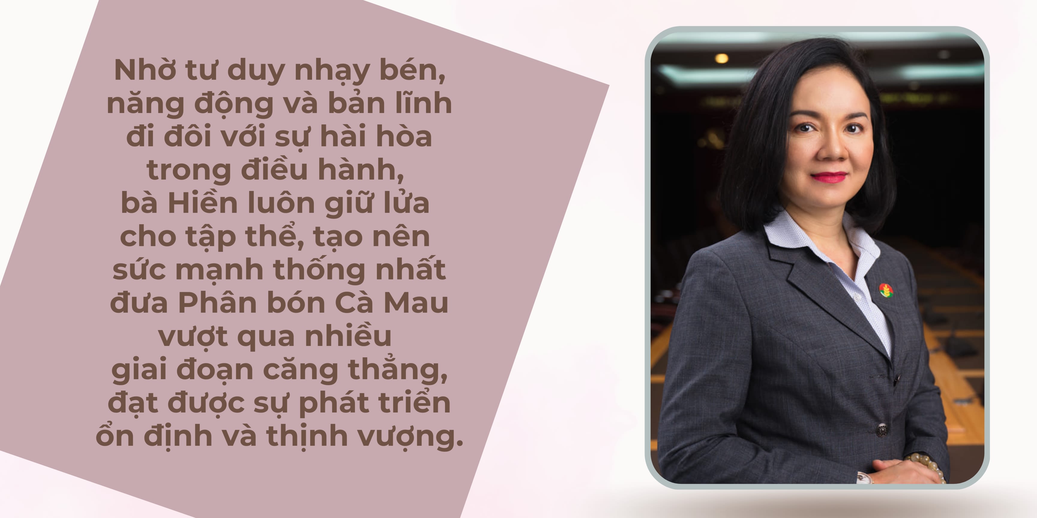 Đảm nhận vai trò đầu tàu, áp lực với nữ doanh nhân Nguyễn Thị Hiền chưa bao giờ vơi. Nhờ tư duy nhạy bén, năng động và bản lĩnh đi đôi với sự hài hòa trong điều hành, bà Hiền luôn giữ lửa cho tập thể, tạo nên sức mạnh thống nhất đưa Phân bón Cà Mau vượt qua nhiều giai đoạn căng thẳng, đạt được sự phát triển ổn định và thịnh vượng.