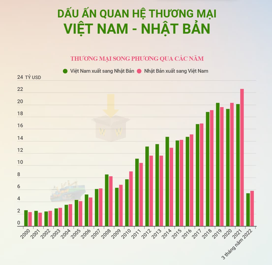Quý I/2022, tổng kim ngạch thương mại giữa hai nước đạt 11,2 tỷ USD, tăng 11% so với cùng kỳ năm 2021, trong đó Việt Nam xuất khẩu sang Nhật Bản gần 5,4 tỷ USD, nhập khẩu 5,8 tỷ USD.