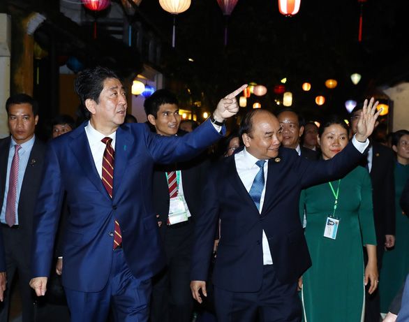 Thủ tướng Nguyễn Xuân Phúc và Thủ tướng Abe Shinzo dạo phố cổ Hội An tối 11/11/2017, trong khuôn khổ Hội nghị thượng đỉnh APEC 2017 tổ chức tại Đà Nẵng. (Ảnh: TTXVN)