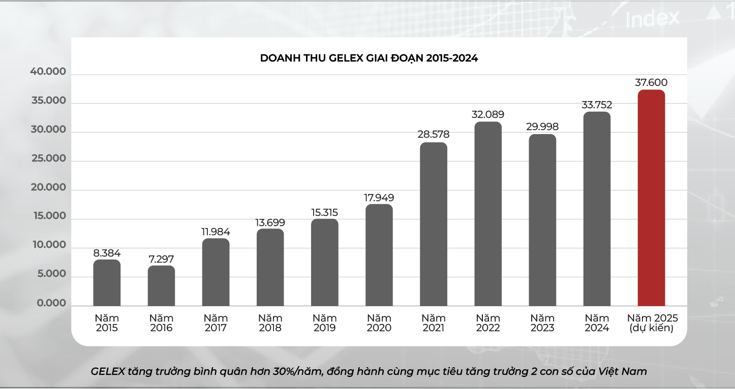 Năm 2024, doanh thu của tập đoàn đạt 33.752 tỷ đồng, lợi nhuận trước thuế đạt 3.613 tỷ đồng, tăng lần lượt 4 lần và 6 lần so với năm 2015. Riêng tổng tài sản của Tập đoàn đã suýt soát chạm mốc 54.000 tỷ đồng, tăng 11 lần so với năm 2015. Năm 2025, GELEX đặt mục tiêu doanh thu 37.600 tỷ đồng – mốc cao kỷ lục của tập đoàn sau hơn 3 thập kỷ phát triển; mức tăng trưởng bình quân mỗi năm hơn 30%.
