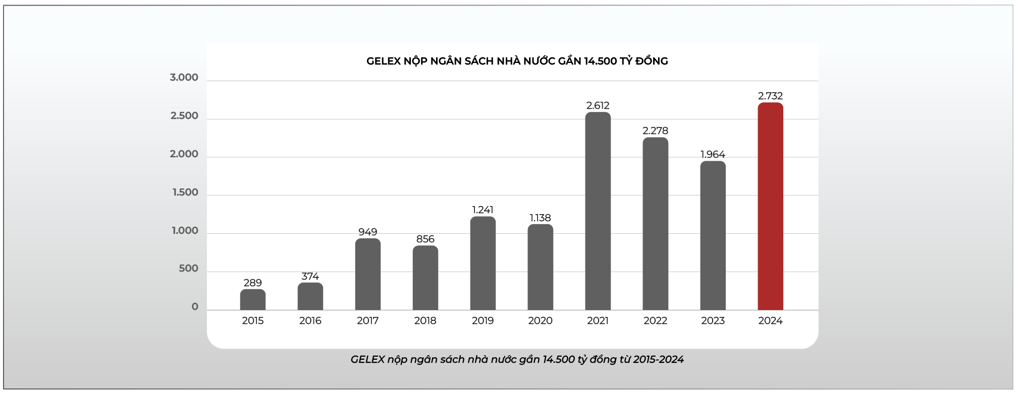 Tính chung trong giai đoạn 2015–2024, GELEX đã nộp gần 14.500 tỷ đồng vào ngân sách, trở thành một trong những doanh nghiệp tư nhân có mức đóng góp cao và ổn định nhất trong lĩnh vực sản xuất công nghiệp.
