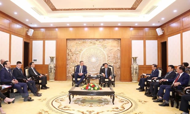 Ủy viên Bộ Chính trị, Chủ tịch Hội đồng Lý luận Trung ương, Giám đốc Học viện Chính trị Quốc gia Hồ Chí Minh Nguyễn Xuân Thắng tiếp Đoàn đại biểu Đảng Dân chủ Xã hội Đức (SPD). (Ảnh: TTXVN)