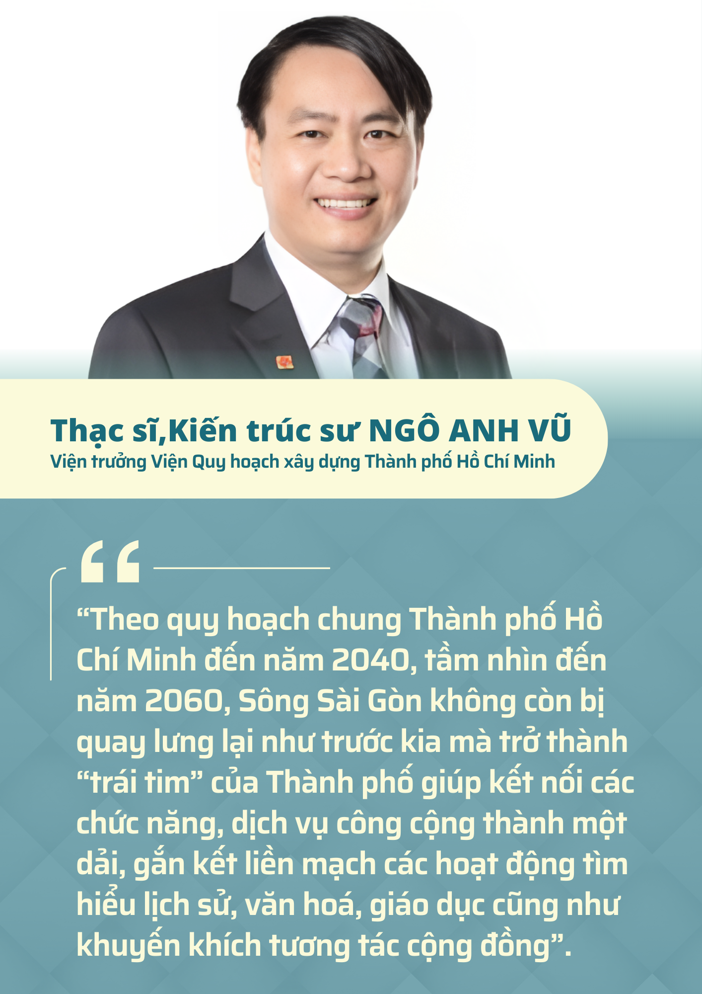 Theo Thạc sĩ, Kiến trúc sư Ngô Anh Vũ, Viện trưởng Viện Quy hoạch xây dựng Thành phố Hồ Chí Minh, dù có đặc trưng đô thị sông nước, Thành phố chưa khai thác hết giá trị ven sông; người dân khó tiếp cận bờ sông; thiếu các không gian công cộng và dịch vụ hỗ trợ. Việc tái cấu trúc đô thị ven sông là cấp thiết, nhất là khi Thành phố đã xác lập không gian phát triển mới. Theo quy hoạch chung đến 2040, tầm nhìn 2060, sông Sài Gòn sẽ trở thành “trái tim” của Thành phố – nơi kết nối lịch sử, văn hóa, giáo dục, sáng tạo và tương tác cộng đồng.