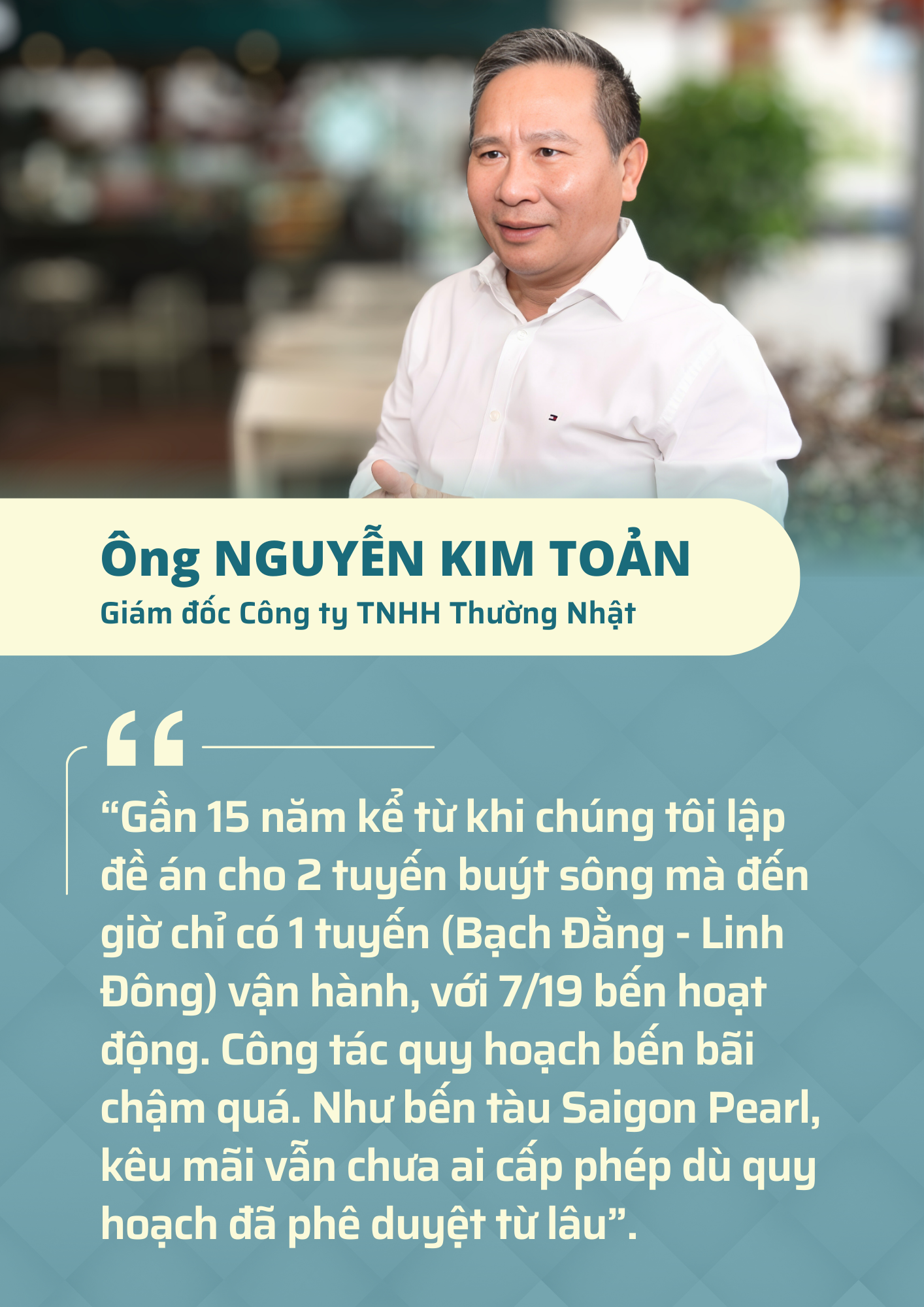 Theo ông, nếu hạ tầng được đầu tư đồng bộ, dòng sông sẽ trở thành "xương sống" giao thông thủy; tạo nên chuỗi hành trình kết hợp làm việc–du lịch–giải trí nối liền các vùng.