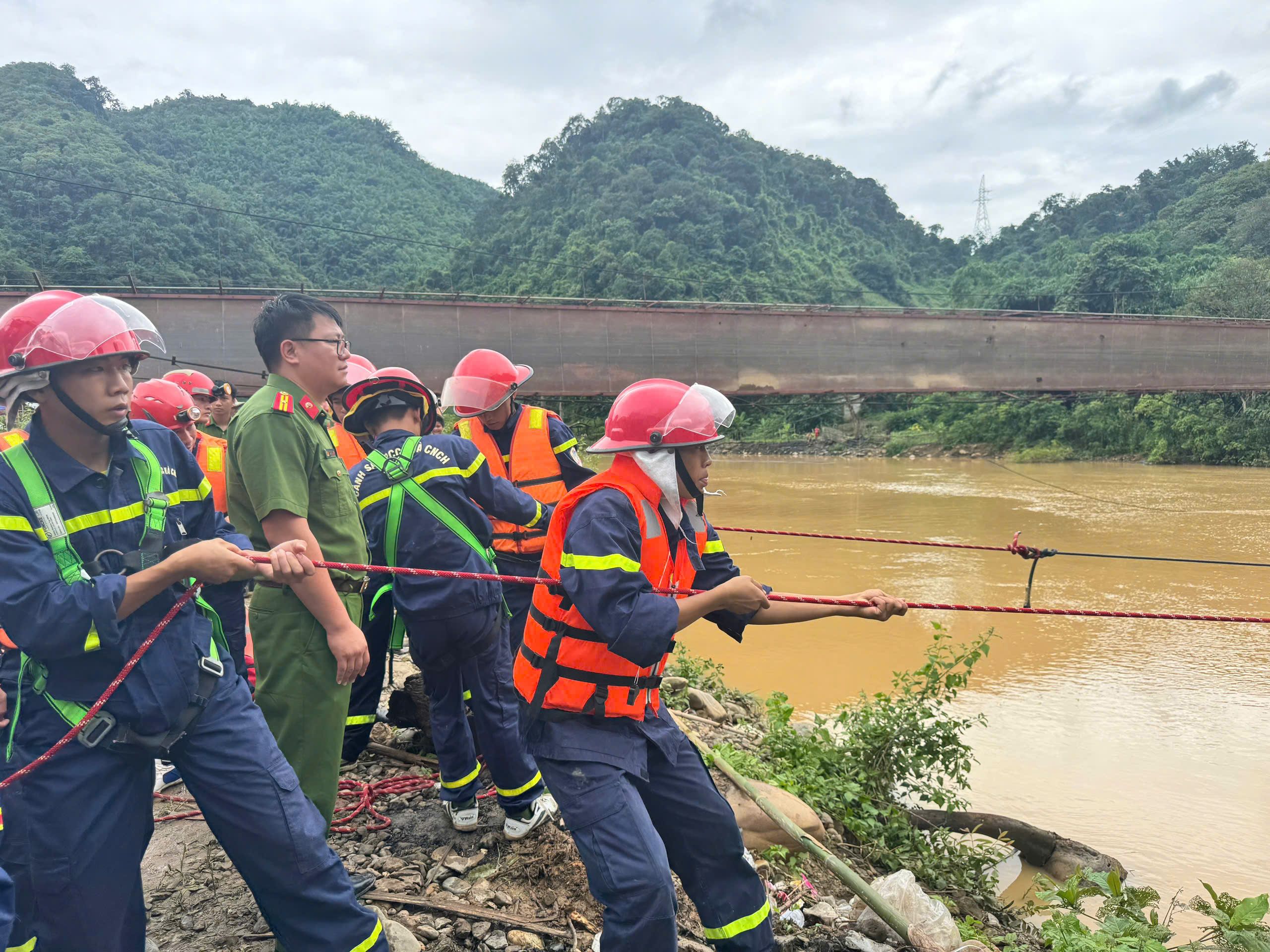 Cán bộ, chiến sĩ Phòng cảnh sát phòng cháy và cứu nạn Công an tỉnh Điện Biên trục vớt phương tiện bị tai nạn.