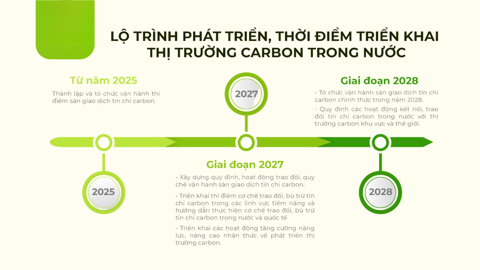 Theo Dự thảo Tờ trình về việc ban hành Nghị định về sàn giao dịch tín chỉ carbon trong nước vừa được Bộ Tài chính xây dựng, giai đoạn thử nghiệm sẽ diễn ra từ năm 2025 đến hết năm 2028, với sự tham gia ban đầu của khoảng 150 nhà máy phát thải lớn trong các ngành nhiệt điện, xi-măng, thép - những lĩnh vực đóng góp tới 40% lượng phát thải toàn quốc. Hàng hóa giao dịch trên sàn bao gồm: hạn ngạch phát thải được phân bổ miễn phí hoặc qua đấu giá; tín chỉ carbon được xác nhận từ các dự án giảm phát thải theo tiêu chuẩn trong nước hoặc quốc tế…