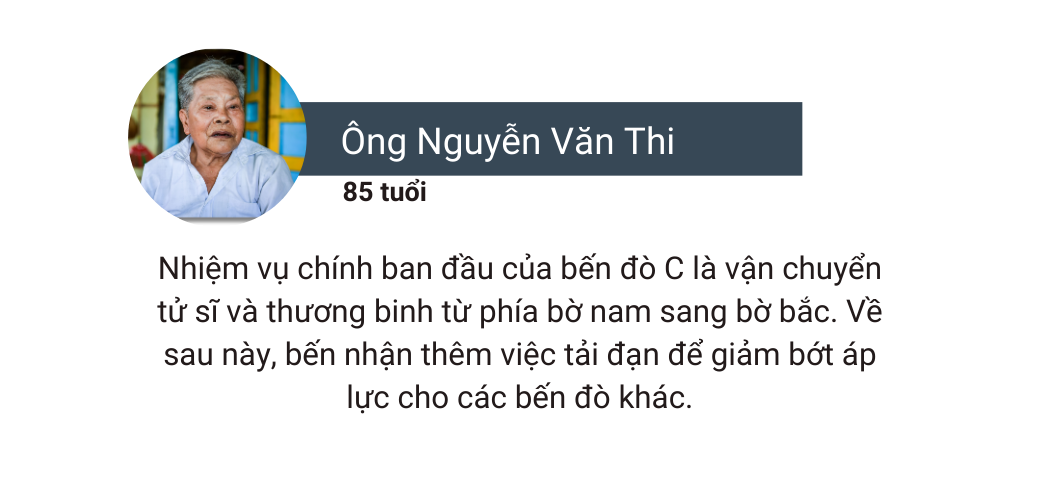 “Nhiệm vụ chính ban đầu của bến đò C là vận chuyển liệt sĩ và thương binh từ phía bờ nam sang bờ bắc. Về sau này, bến nhận thêm việc tải đạn để giảm bớt áp lực cho các bến đò khác”, ông Thi khẳng định với phóng viên.