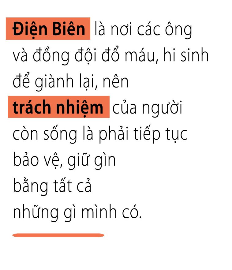 Ngừng lại một lát, bà Biên tiếp lời: “Ngày bé, chúng tôi thắc mắc vì sao bố mẹ lại bỏ quê dưới đồng bằng để lên núi với rất nhiều khó khăn. Cả hai cụ (bố chồng và bố đẻ - PV) đều bảo: Điện Biên là nơi các ông và đồng đội đổ máu, hi sinh để giành lại. Nên trách nhiệm của người còn sống là phải tiếp tục bảo vệ, giữ gìn bằng tất cả những gì mình có”.