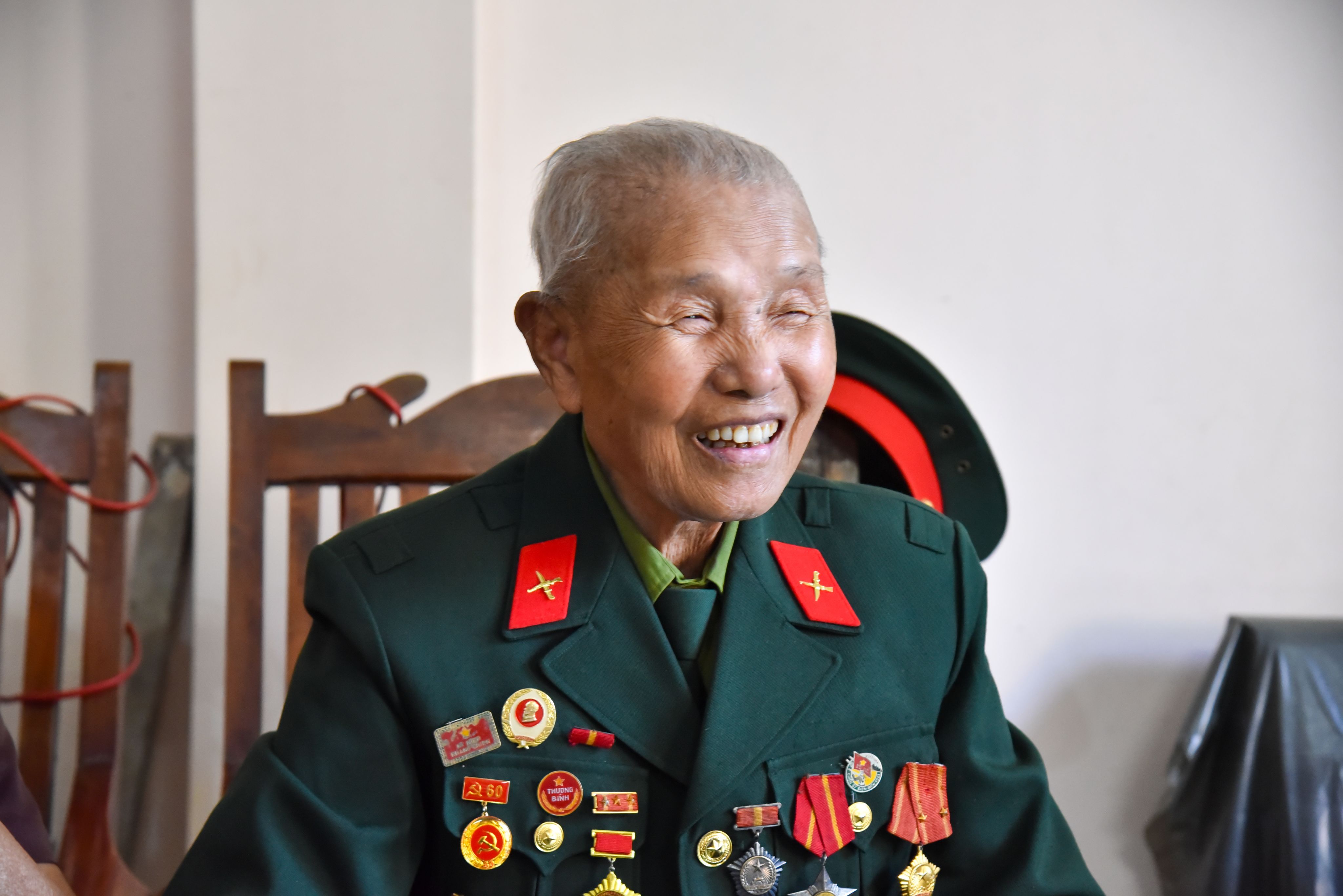 Thấy khách tới hỏi, cụ Phạm Văn Ngân run run thay áo quần, đeo lên ngực tấm huy hiệu chiến sĩ Điện Biên đã bạc phếch màu năm tháng.