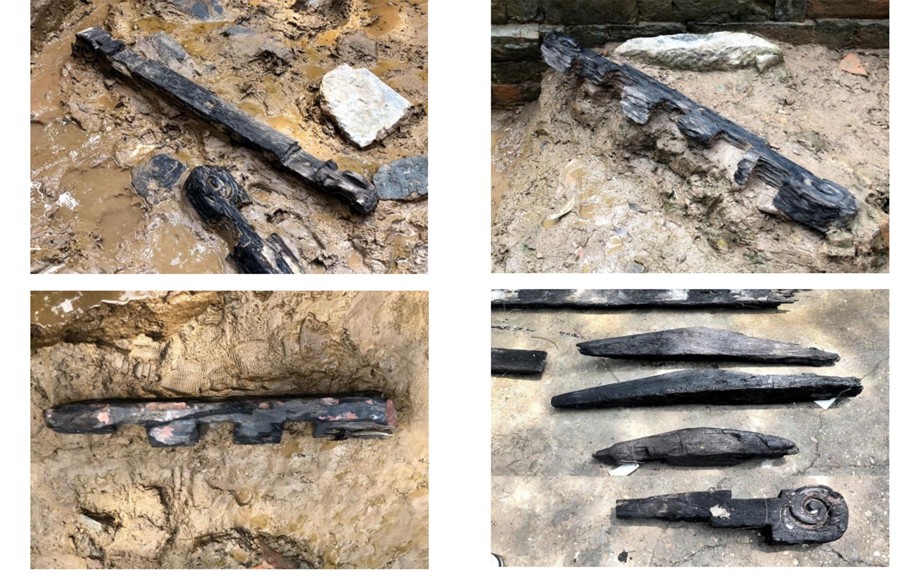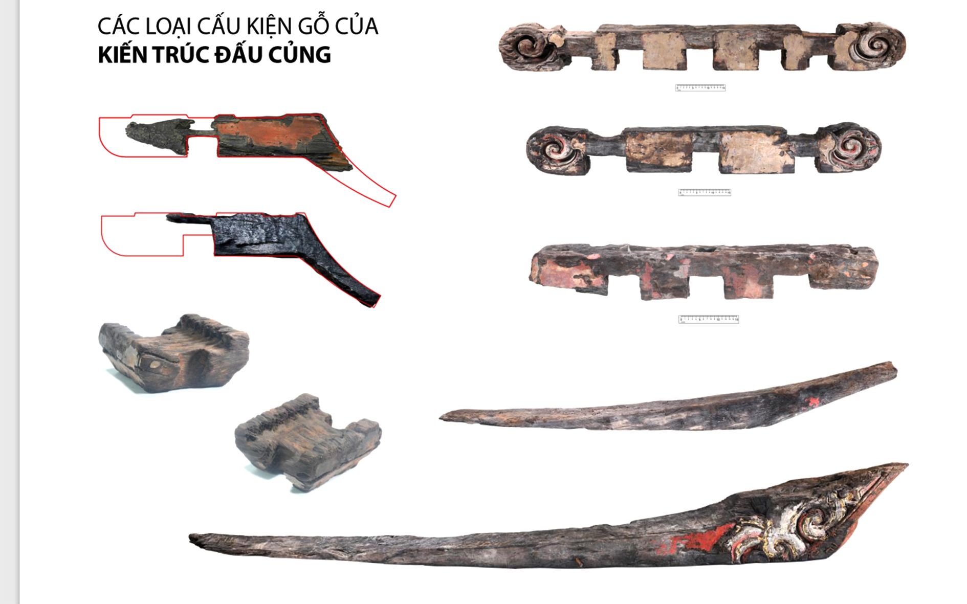 Điều đặc biệt là, nhiều cấu kiện gỗ có thể thấy còn nguyên lớp sơn thếp màu đỏ và màu vàng tô trên các họa tiết hoa văn. Phó Giáo sư, Tiến sĩ Bùi Minh Trí, Viện trưởng Viện nghiên cứu Kinh thành cho biết, phân tích cho thấy những lớp vàng này đều là vàng chất lượng cao (vàng 9999).