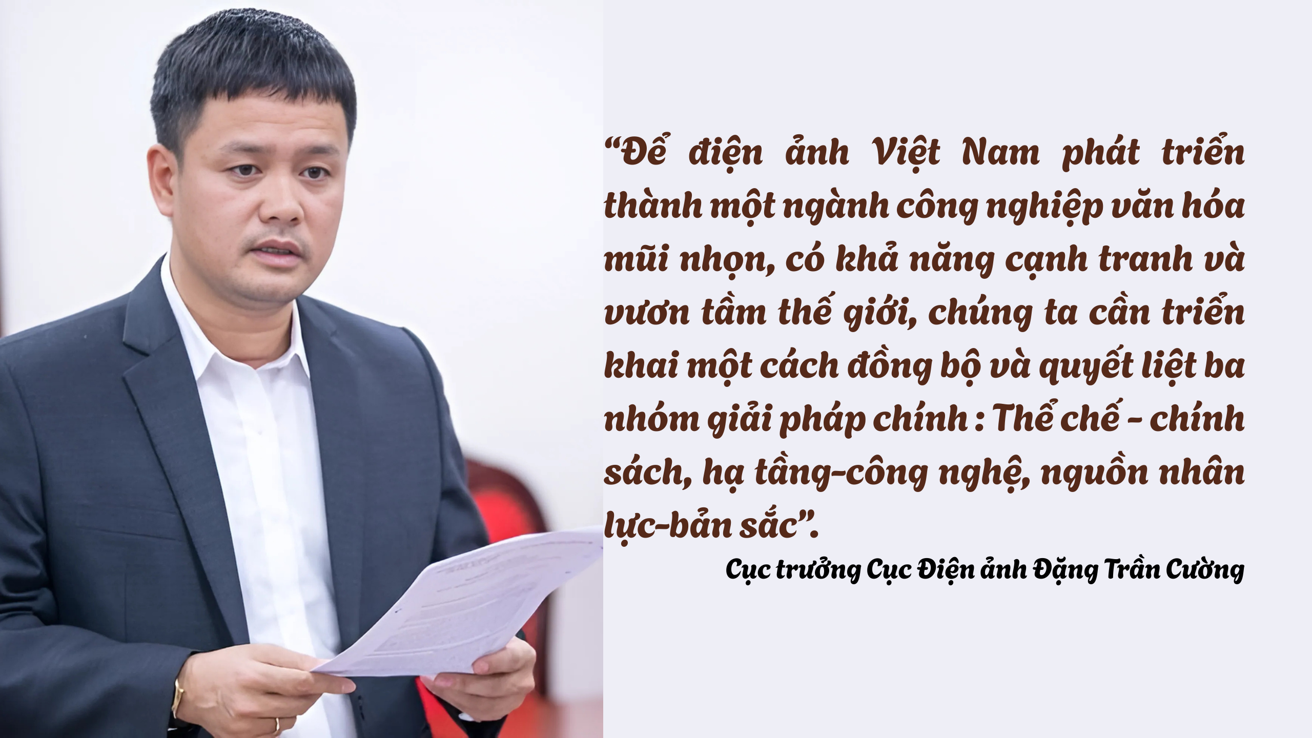 Cục trưởng Cục Điện ảnh Đặng Trần Cường: Để điện ảnh Việt Nam không chỉ giữ vững mà còn phát triển thành một ngành công nghiệp văn hóa mũi nhọn, có khả năng cạnh tranh và vươn tầm thế giới, chúng ta cần triển khai một cách đồng bộ và quyết liệt ba nhóm giải pháp chính. Đây là những trụ cột để xây dựng một nền điện ảnh vững mạnh từ gốc rễ đến ngọn.