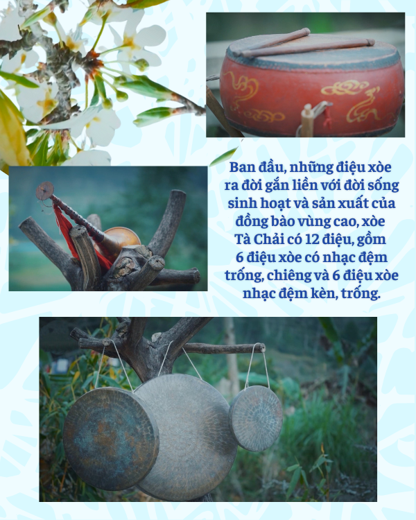 Ban đầu, những điệu xòe ra đời gắn liền với đời sống sinh hoạt và sản xuất của đồng bào vùng cao, xòe Tà Chải có 12 điệu, gồm 6 điệu xòe có nhạc đệm trống, chiêng và 6 điệu xòe nhạc đệm kèn, trống. Theo thời gian, người Tày nơi đây lại tiếp tục cho ra đời những điệu xòe mới, như: xòe trồng đậu, xòe đan sao, xòe hái chè, xòe mời rượu... Sự ra đời của các điệu xòe mới làm cho kho tàng nghệ thuật xòe ngày càng thêm phong phú. Tiếng kèn, tiếng trống của ông, của cha như nhịp ru những đứa trẻ từ vành nôi, lớn lên đôi chút, đứa trẻ được ngắm nhìn điệu xòe của bà, của mẹ.