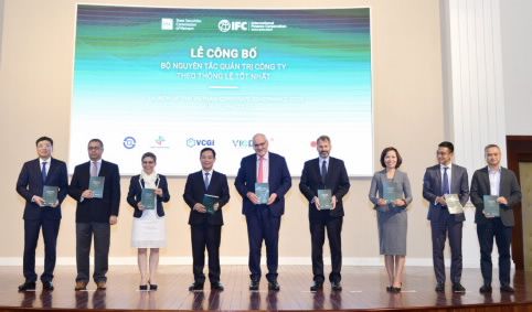 Đại diện Ủy ban Chứng khoán Nhà nước, IFC và các tổ chức liên quan nhận tài liệu tại lễ công bố Bộ Nguyên tắc Quản trị Công ty theo Thông lệ Tốt nhất dành cho các công ty đại chúng của Việt Nam.