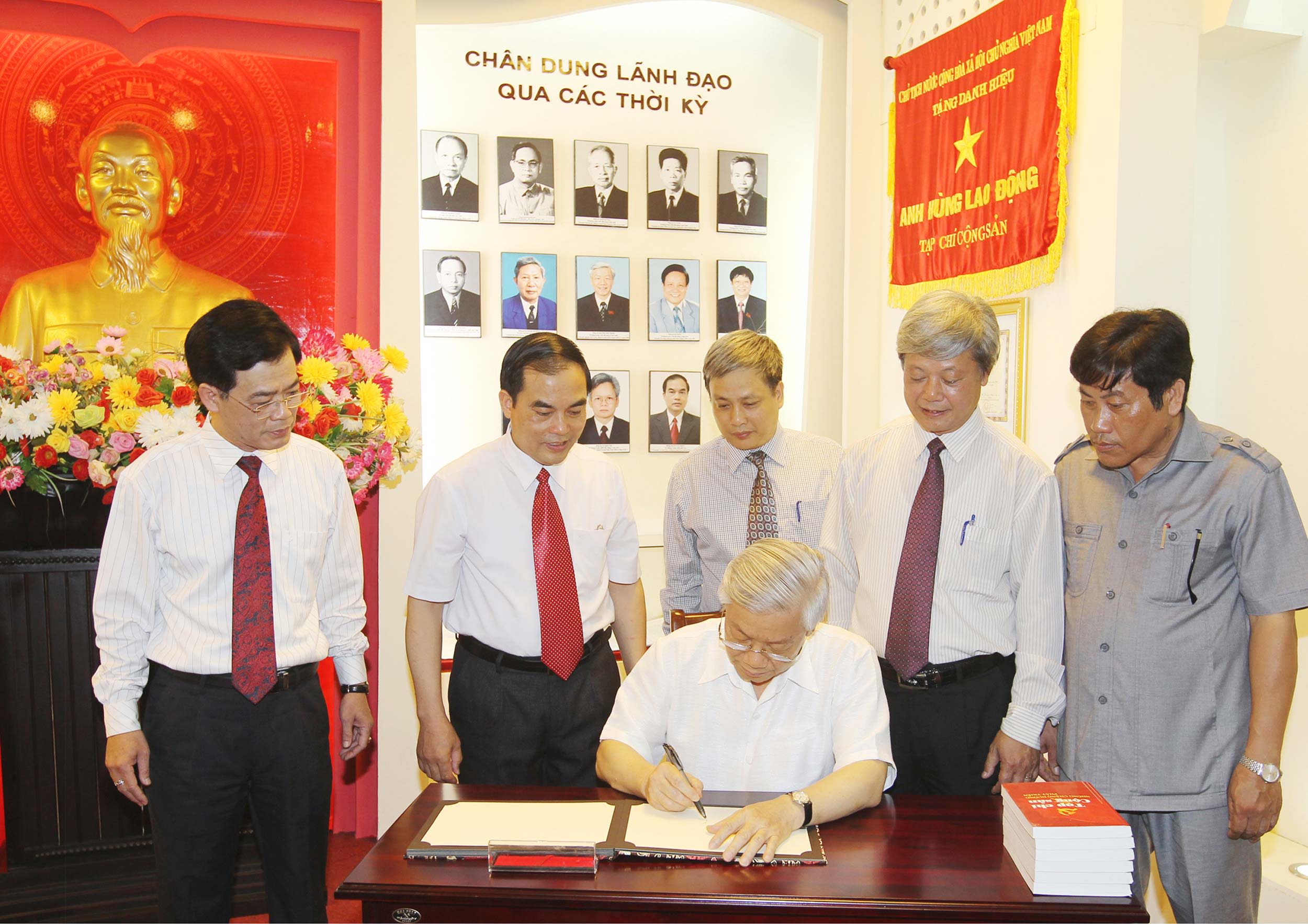 Đồng chí Nguyễn Phú Trọng, Tổng Bí thư Ban Chấp hành Trung ương Đảng Cộng sản Việt Nam, nguyên Tổng Biên tập Tạp chí Cộng sản viết lưu bút tại Phòng truyền thống Tạp chí Cộng sản, ngày 9/6/2012. (Ảnh: Lưu trữ TCCS)