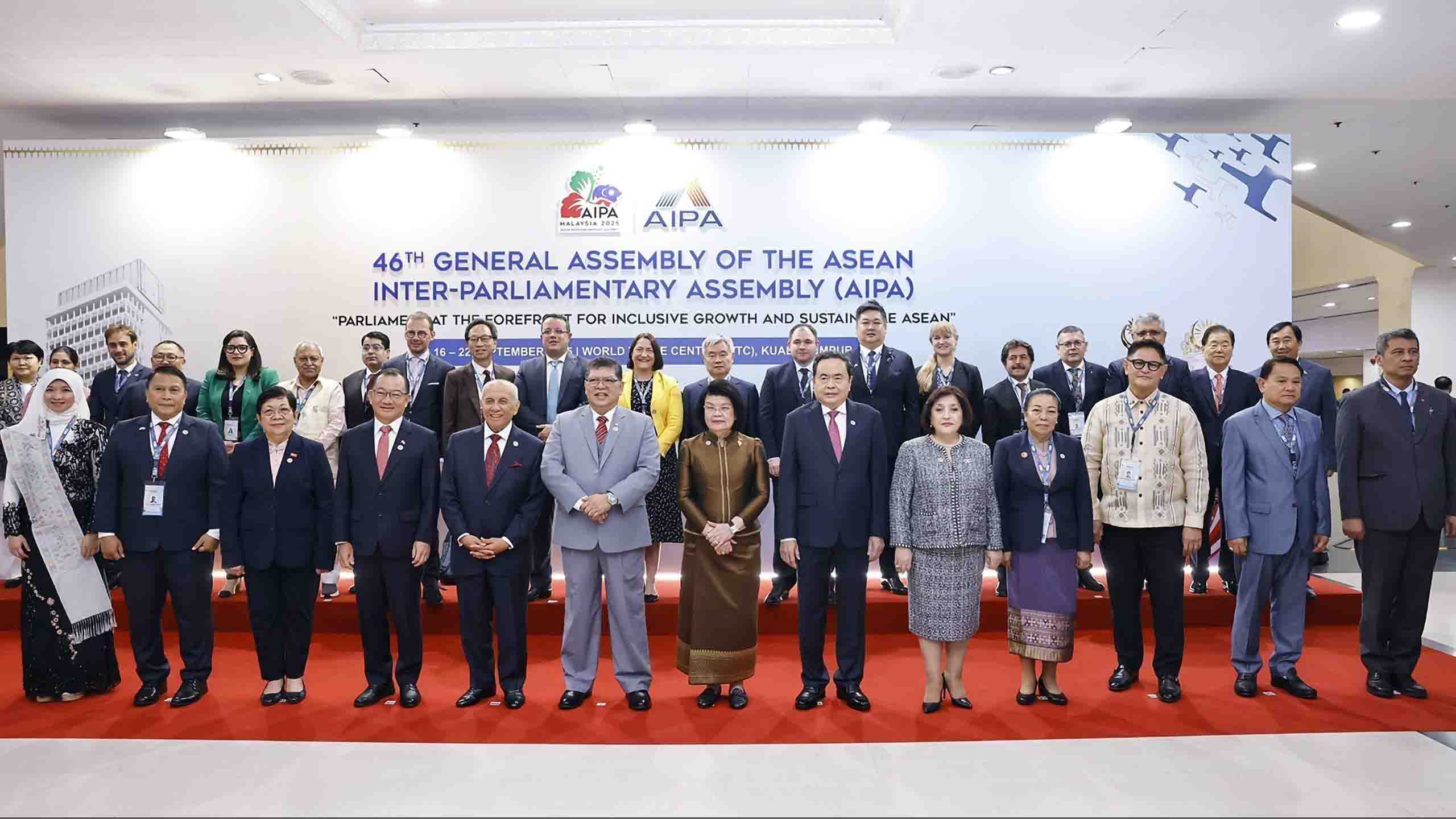Chủ tịch Quốc hội Trần Thanh Mẫn cùng các Trưởng đoàn Nghị viện thành viên AIPA chụp ảnh chung với ông Johari Abdul, Chủ tịch Hạ viện Malaysia, Chủ tịch AIPA-46. (Ảnh: TTXVN)