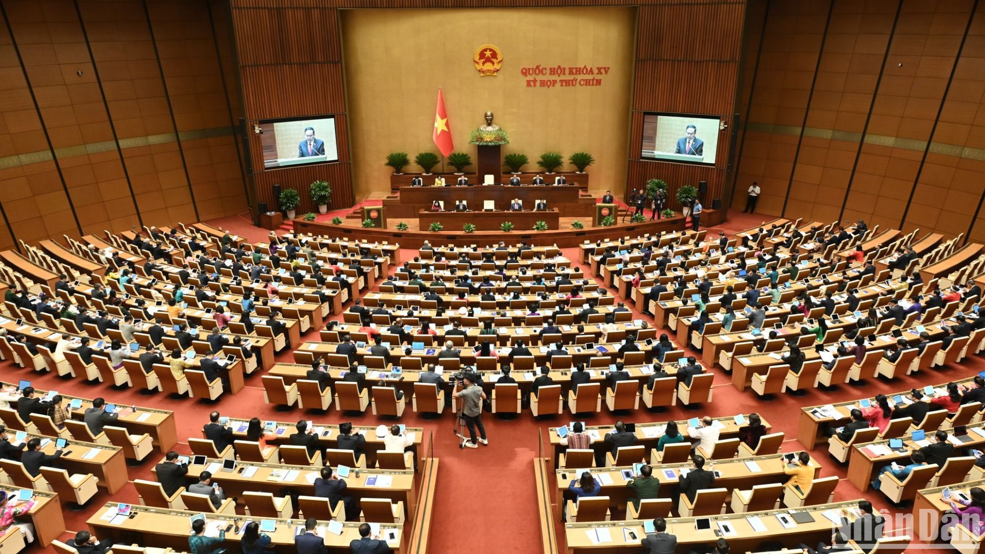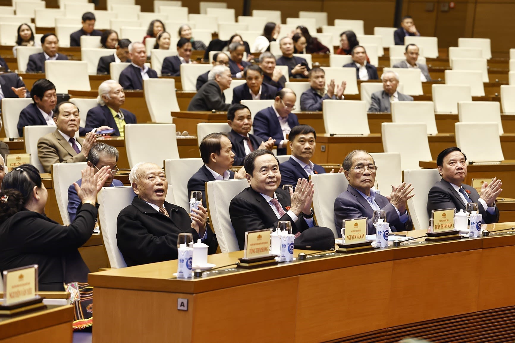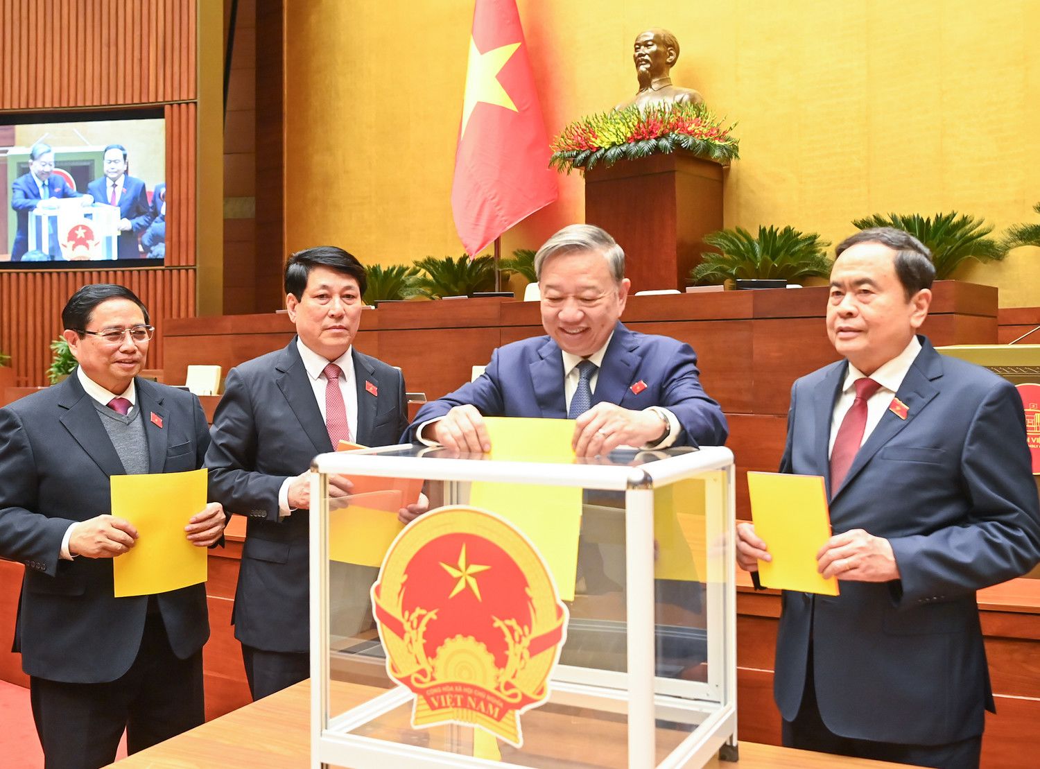 Tổng Bí thư Tô Lâm, Chủ tịch nước Lương Cường, Thủ tướng Phạm Minh Chính, Chủ tịch Quốc hội Trần Thanh Mẫn và các đại biểu Quốc hội bỏ phiếu bầu Phó Chủ tịch Quốc hội và Ủy viên Ủy ban Thường vụ Quốc hội; phê chuẩn đề nghị của Thủ tướng Chính phủ về việc bổ nhiệm các Phó Thủ tướng Chính phủ, Bộ trưởng và thành viên khác của Chính phủ nhiệm kỳ 2021-2026. (Ảnh: Báo Nhân Dân)