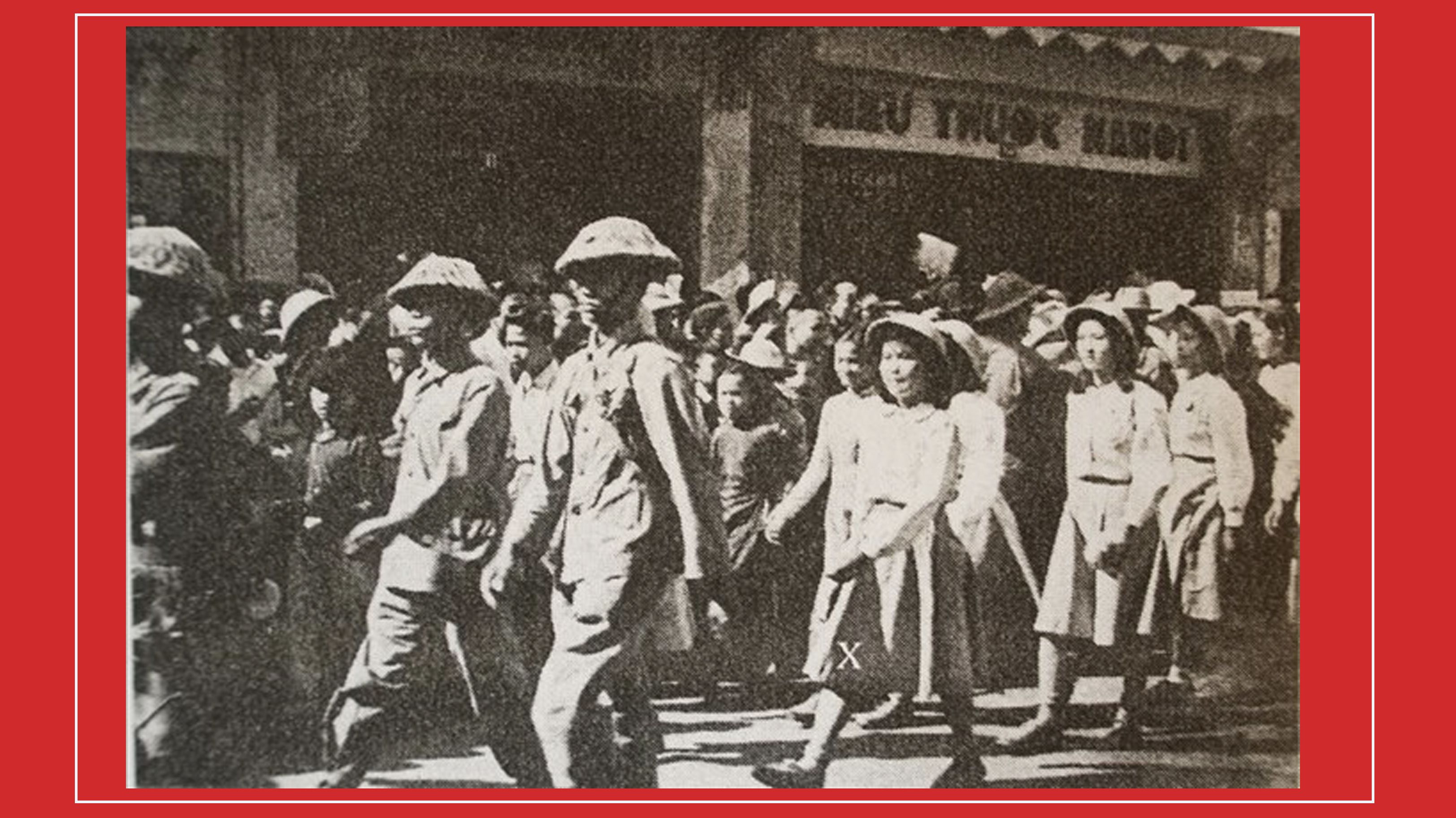 Hòa cùng nhân dân, thanh thiếu nhiên đường phố tay trong tay, cờ hoa, biểu ngữ, khẩu hiệu sung sướng vẫy chào đoàn quân trở về sau 9 năm xa cách. Hà Nội là một rừng cờ đỏ và khẩu hiệu. Đồng bào và bộ đội, bao dồn nén, chờ đợi bừng lên như sóng trào, cờ đỏ, hoa tươi tung cao vào hàng ngũ bộ đội đang đều tăm tắp đi trên đường phố, hoa rơi trên mũ lưới, hoa bám vào cáng xe kéo pháo, hoa đọng trên quốc kỳ, quân kỳ. Nhiều bà con mừng vui lau nước mắt vì chờ mong, vì cảm động.