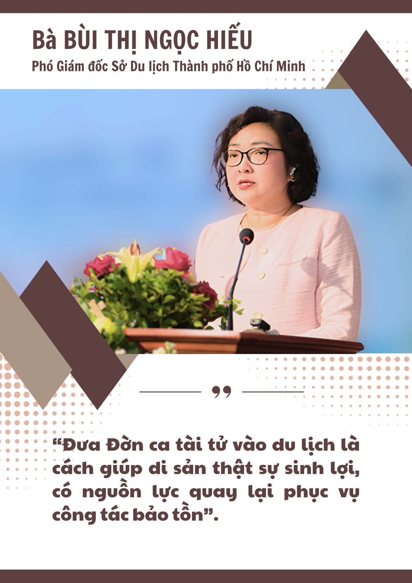 Lắng nghe người trong cuộc, Sở Văn hoá và Thể thao Thành phố Hồ Chí Minh đã giới thiệu nhiều đoàn Đờn ca tài tử của Thành phố tham gia biểu diễn quốc tế, quảng bá hình ảnh Việt Nam và văn hoá Nam Bộ. Sở Du lịch Thành phố Hồ Chí Minh cũng phối hợp với ngành văn hoá để đưa Đờn ca tài tử biểu diễn tại các điểm du lịch trên địa bàn. Hoạt động này đã góp phần tạo thêm sức thu hút các điểm đến, đồng thời giúp cho du khách, nhất là khách nước ngoài hiểu thêm di sản âm nhạc dân tộc của Việt Nam.