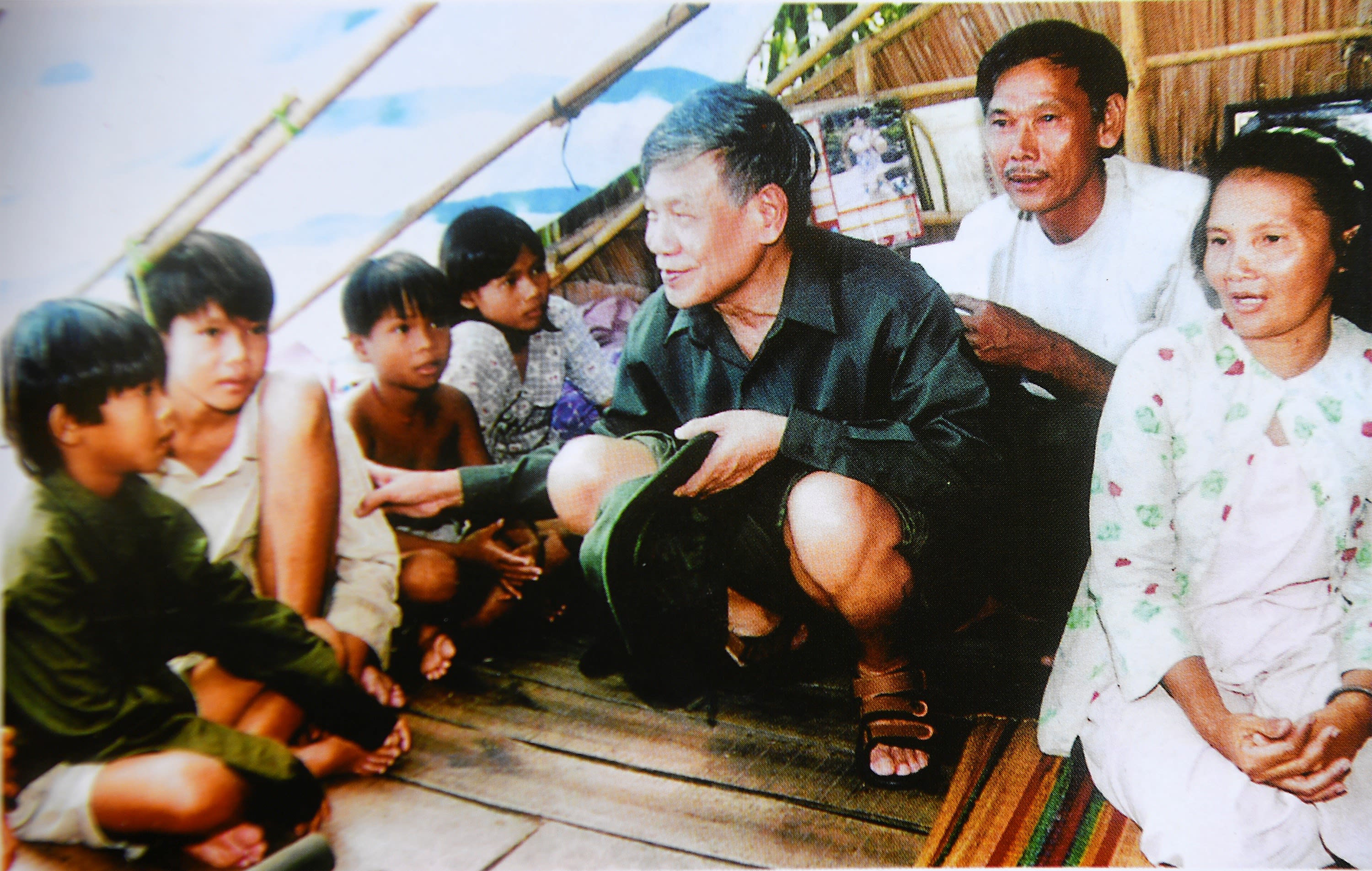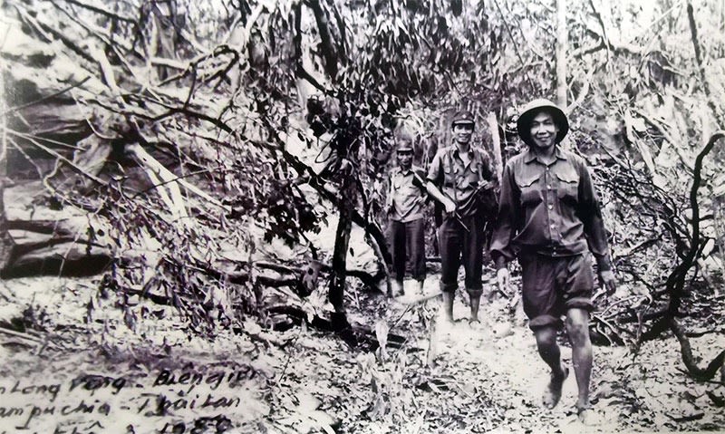 Nguyên Tổng Bí thư Lê Khả Phiêu (lúc đó là Thiếu tướng, Chủ nhiệm Chính trị Mặt trận Quân tình nguyện Việt Nam tại Campuchia) trong một chuyến công tác tại vùng núi phía Bắc Campuchia năm 1986. Ảnh tư liệu.