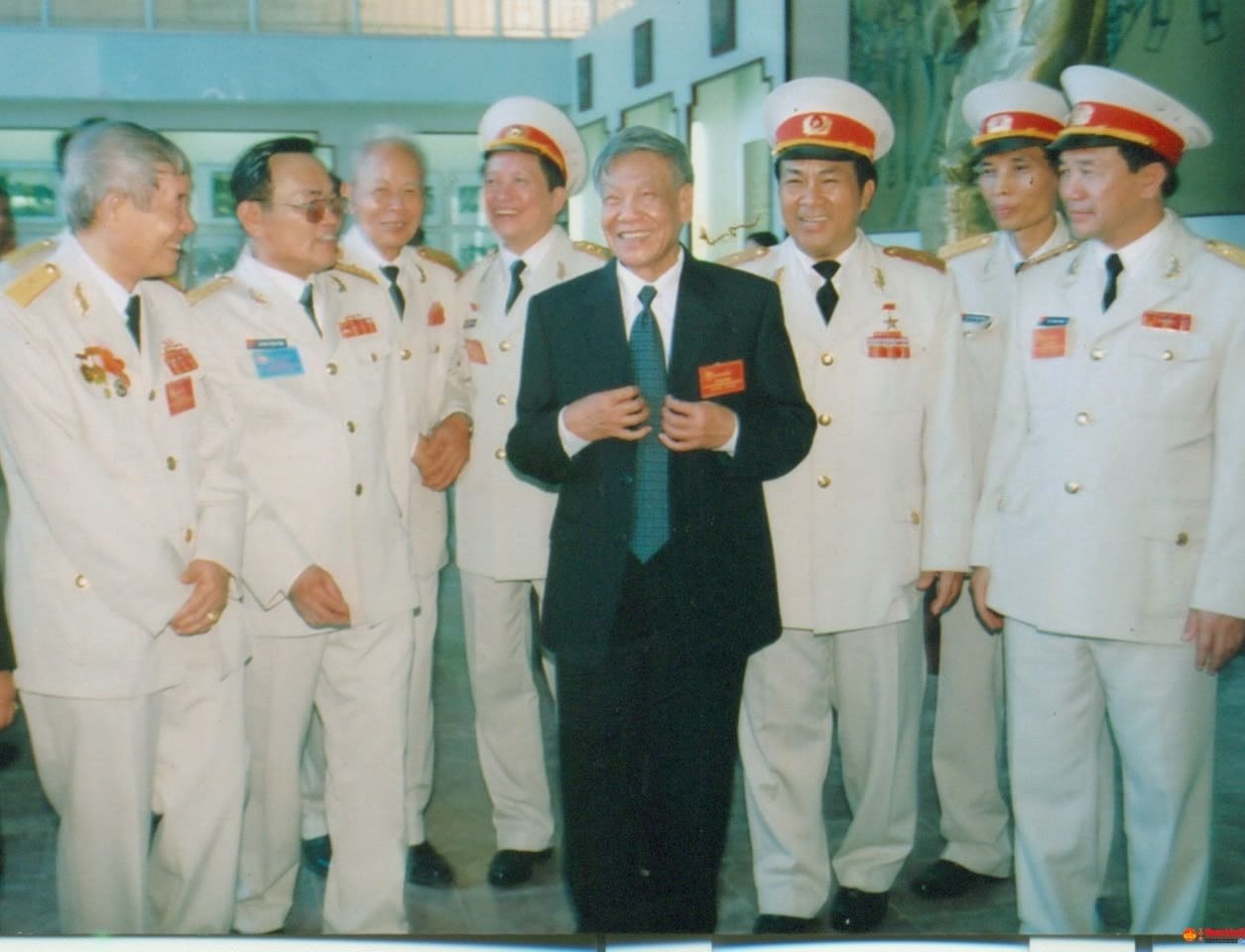 Đồng chí Lê Khả Phiêu trò chuyện cùng các đồng chí trong Đảng ủy, Bộ Tư lệnh Quân khu 4 và nước bạn Lào năm 1998. Ảnh: baoquankhu4.com.vn.