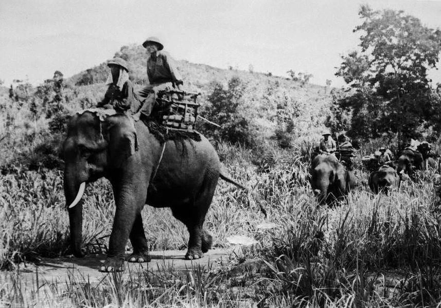 Đại tướng Võ Nguyên Giáp cùng Tư lệnh Binh đoàn Trường Sơn Đồng Sỹ Nguyên thăm bộ đội Trường Sơn.