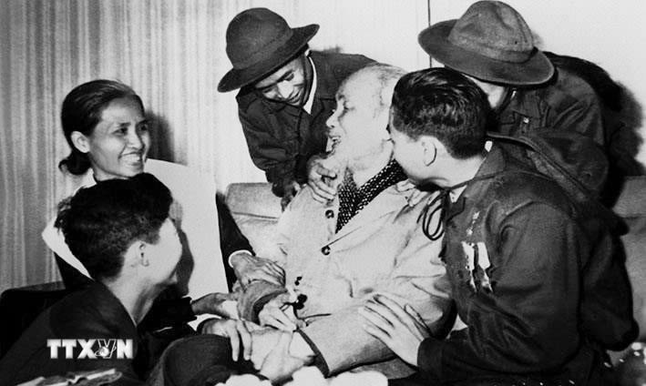 Chủ tịch Hồ Chí Minh với các Anh hùng, Dũng sĩ diệt Mỹ trong Đoàn đại biểu Mặt trận Dân tộc Giải phóng miền nam Việt Nam tại Phủ Chủ tịch ngày 28/2/1969. Ảnh: TTXVN