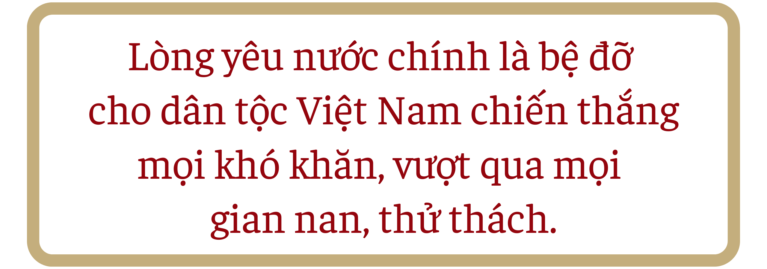 Họ hy sinh, cống hiến tính mạng mình mà không hề đòi hỏi bất cứ điều gì từ những sự hy sinh cao cả ấy, bởi khi nhân dân Việt Nam cầm vũ khí ra chiến trường, họ chỉ có một mục tiêu duy nhất - đó là chiến đấu để cho nước nhà được độc lập, thống nhất, nhân dân được tự do, hạnh phúc. Lòng yêu nước giúp họ đạt được những mục tiêu cao cả đó. Lòng yêu nước chính là bệ đỡ cho dân tộc Việt Nam chiến thắng mọi khó khăn, vượt qua mọi gian nan, thử thách.