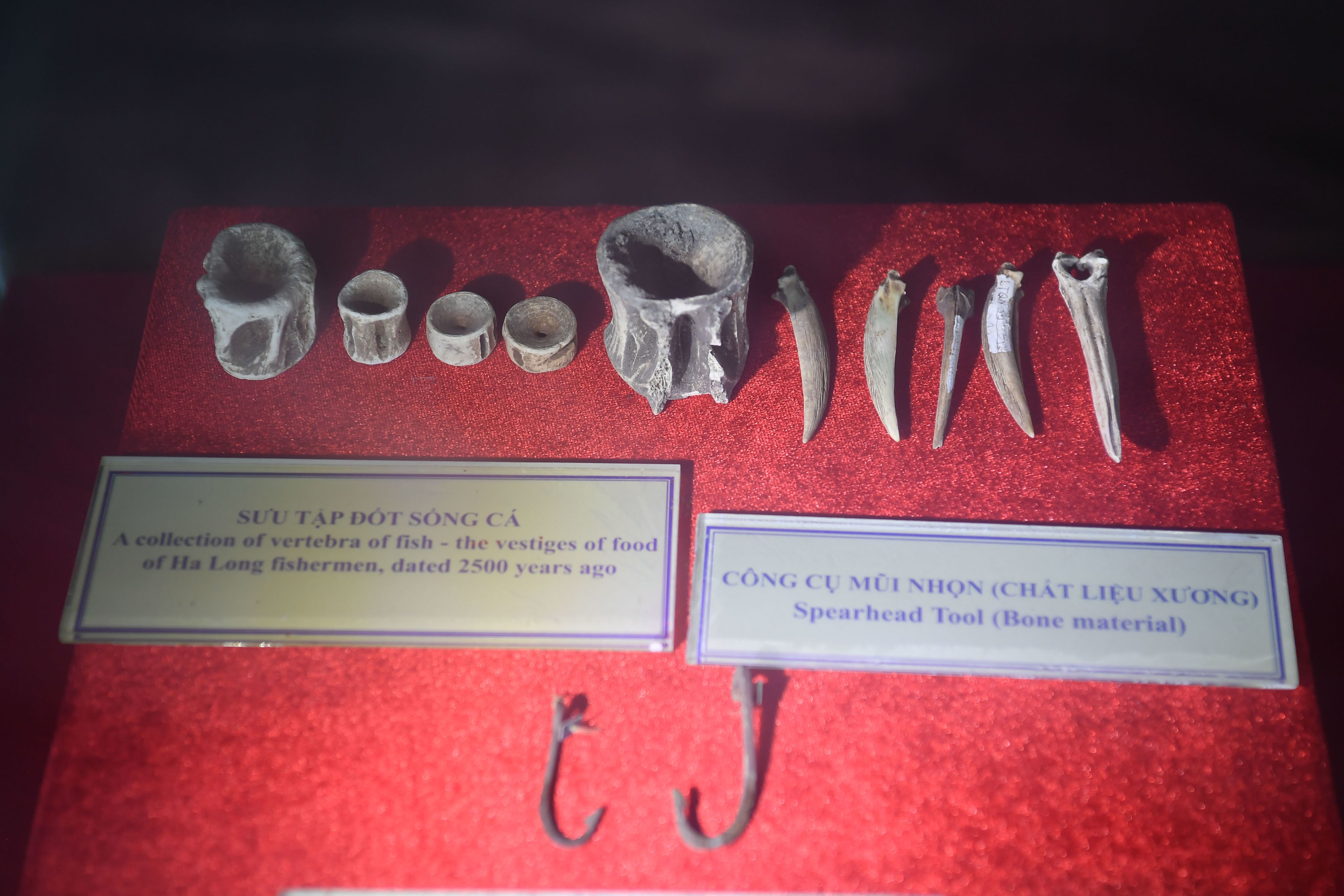 Trưng bày hiện vật khảo cổ ở hang Tiên Ông.