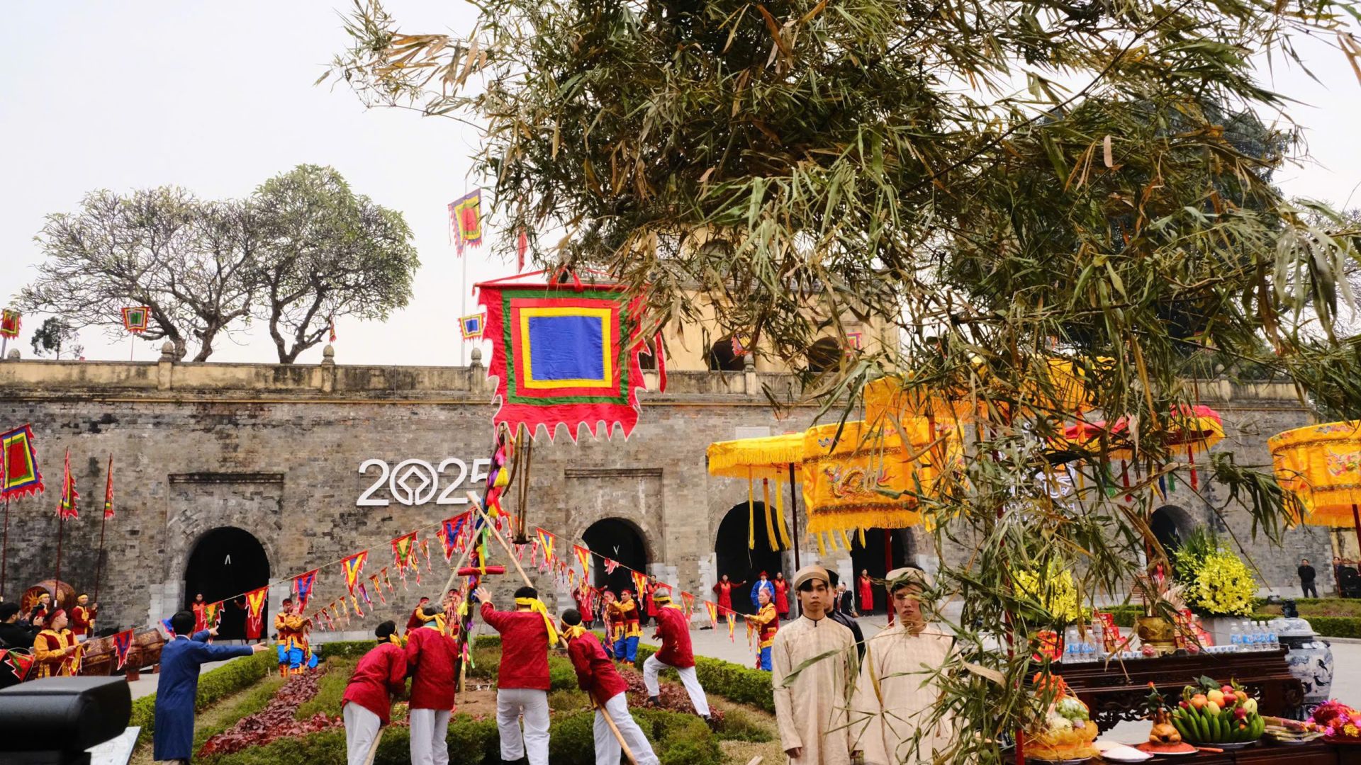 Lễ dựng cây nêu - một nghi thức không thể thiếu trong dịp Tết được thực hiện trang trọng tại không gian trước Đoan môn. Ảnh: hoangthanhthanglong.vn