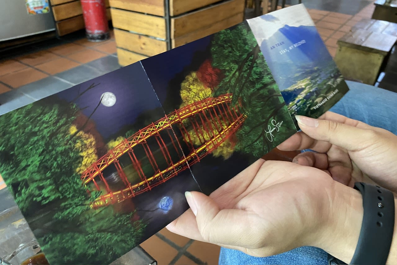 Các trang giới thiệu trong tờ áo đều có hình ảnh gia đình An và đặc biệt bức vẽ cầu Thê Húc cong cong màu đỏ với sự phản chiếu hình ảnh dưới nước là bức mà vợ An vẽ tặng với gửi gắm về sự kết nối, tương tác giữa vốn văn hoá truyền thống từ nơi An sinh ra với thế giới nơi An đóng góp phần nào tiếng đàn của mình.