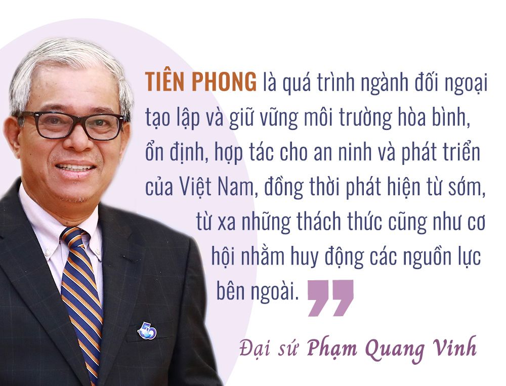 Trước hết, tôi muốn nhấn mạnh đến “vai trò tiên phong” của đối ngoại. “Tiên phong” là quá trình ngành đối ngoại tạo lập và giữ vững môi trường hòa bình, ổn định, hợp tác cho an ninh và phát triển của Việt Nam, đồng thời phát hiện từ sớm, từ xa những thách thức cũng như cơ hội nhằm huy động các nguồn lực bên ngoài. Từ đó, dự báo, tham mưu chiến lược về đối ngoại, nhất là các vấn đề tác động trực tiếp, lâu dài đến an ninh, phát triển của đất nước và các vấn đề cấp bách trước mắt là phục hồi kinh tế sau đại dịch.