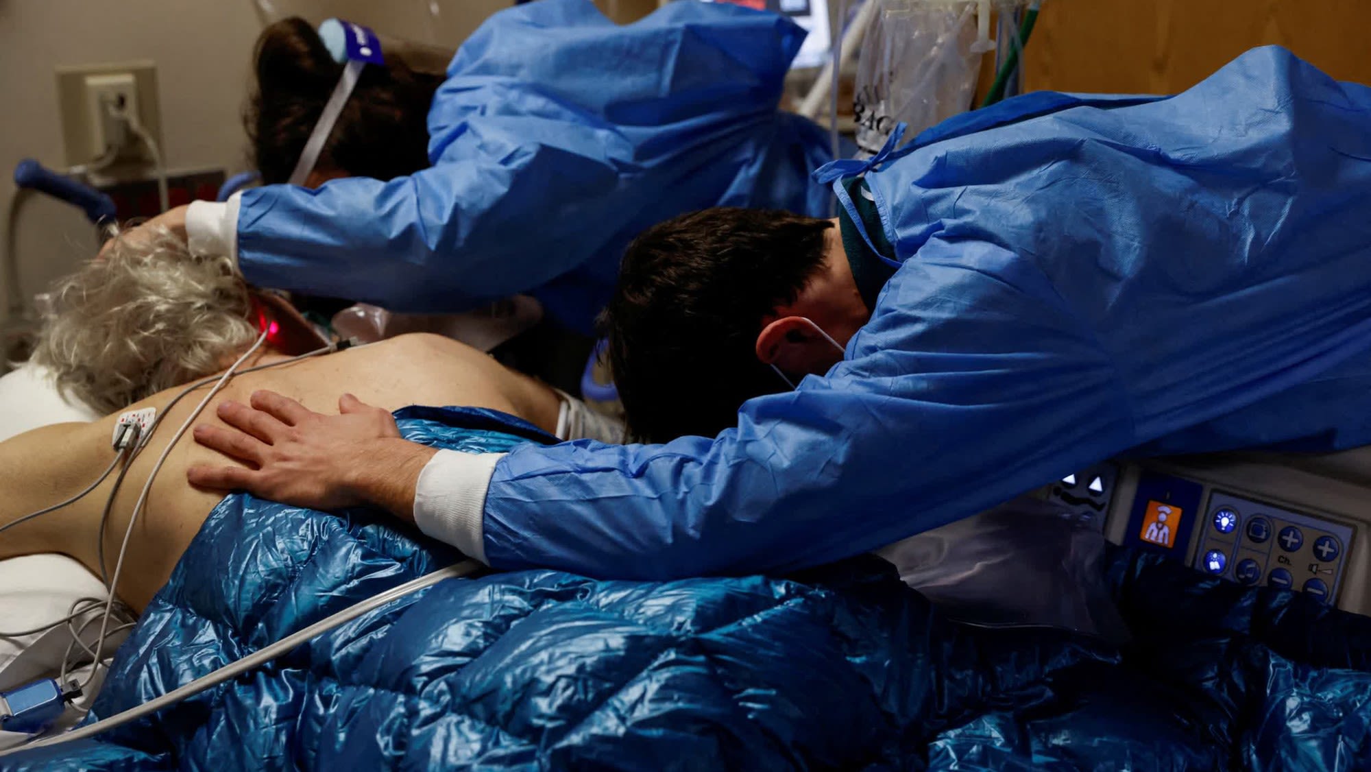 Một bệnh nhân mắc Covid-19 nằm trong vòng tay của các con trước khi ông được đặt nội khí quản tại một bệnh viện ở Mission Viejo, bang California, Mỹ. Trong tháng 1/2022, số ca nhập viện tại Mỹ gia tăng được cho là có liên quan đến biến thể Omicron. (Ảnh: Reuters)