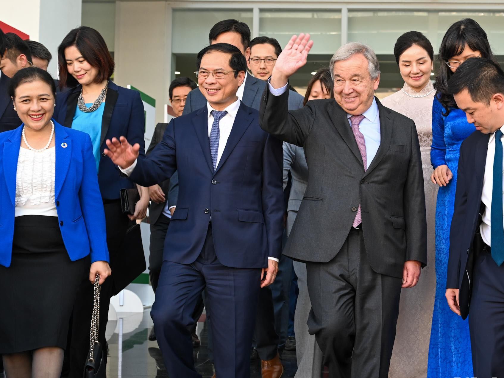 Tổng Thư ký Liên hợp quốc Antonio Guterres vẫy tay chào các bạn trẻ, sinh viên tại Học viện Ngoại giao. (Ảnh: Duy Linh)