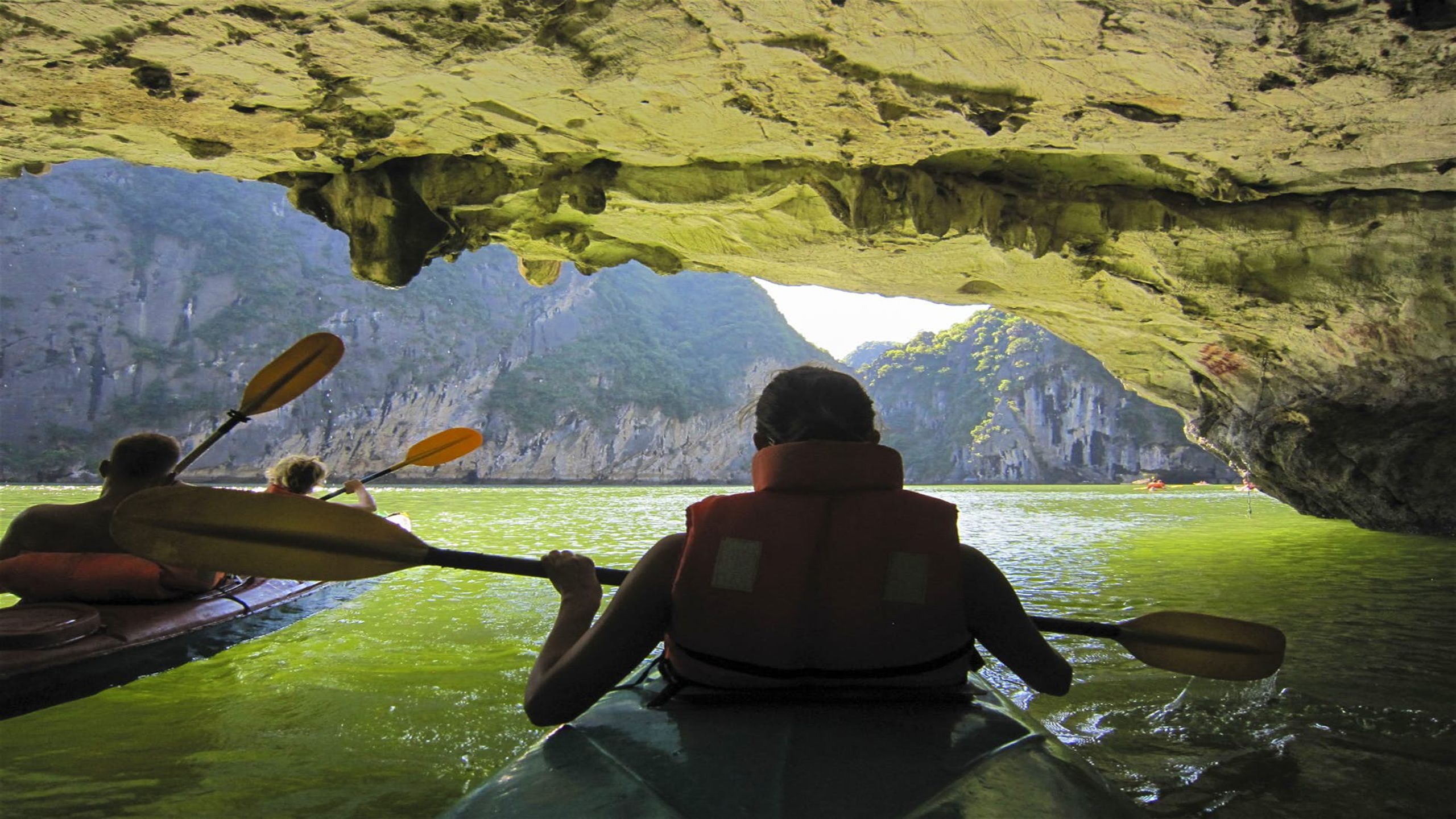 Khách du lịch nước ngoài trải nghiệm chèo kayak trên vịnh Hạ Long.