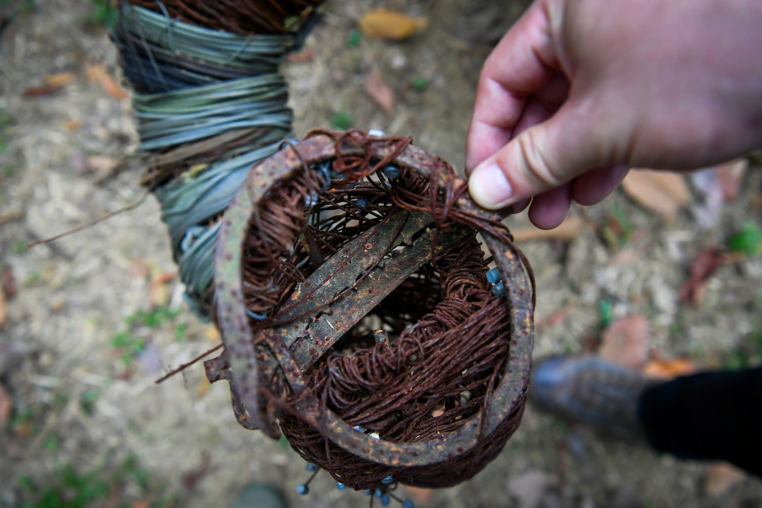 Phần đầu của vòi voi làm bằng bẫy kẹp - một loại bẫy có tính sát thương rất cao, có khả năng gây nhiễm trùng cho các loại thú không may gặp phải.