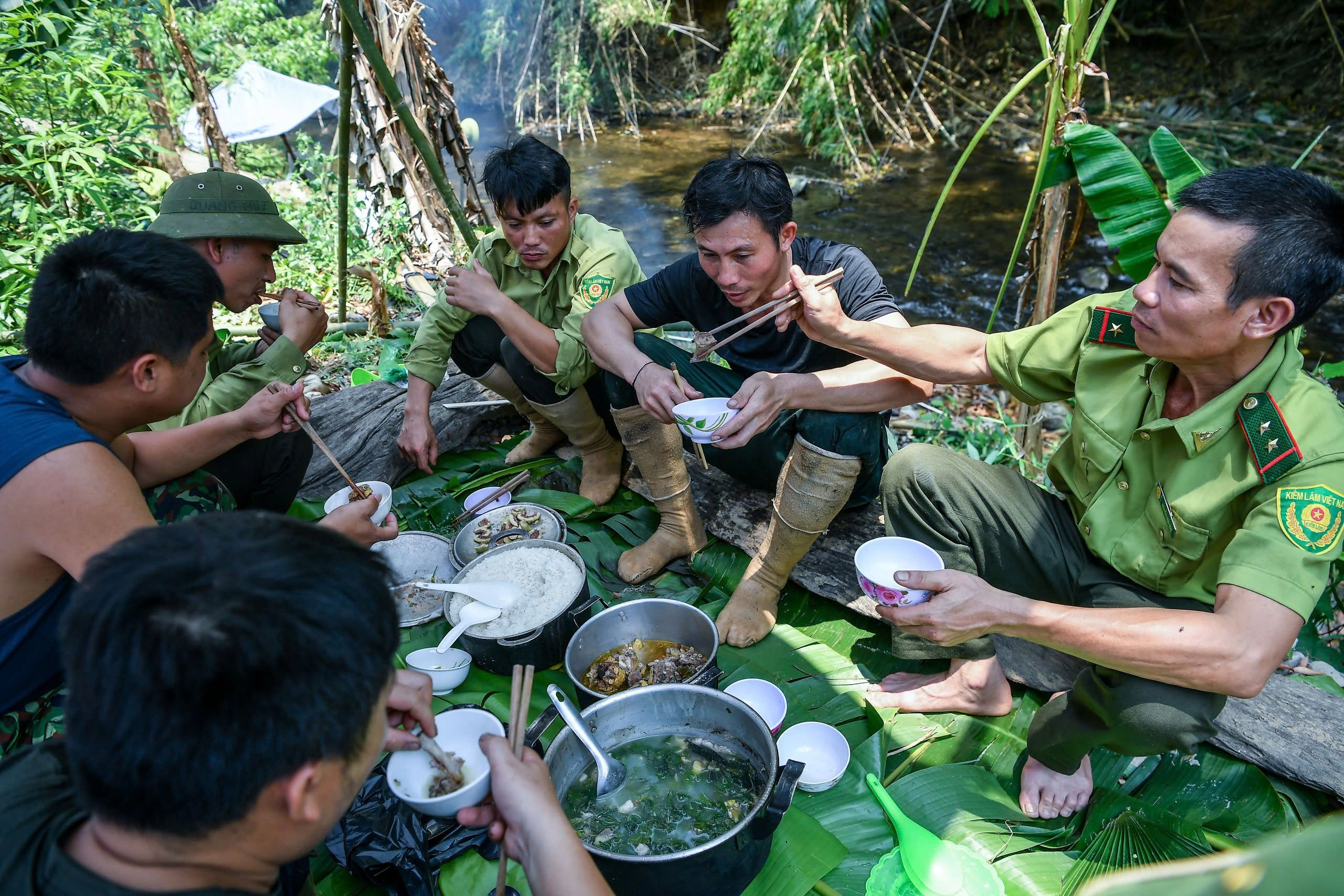 Chiều cùng ngày, sau hơn 5 tiếng băng rừng, gỡ bẫy, kiểm tra hiện trạng vùng rừng lõi Khe Choăng, cả đoàn quyết định hạ trại ven một con suối nhỏ. Một bếp lửa dã chiến được nổi lên, bữa cơm đơn sơ giữa đại ngàn cũng được chuẩn bị. Quây quần bên bếp lửa, anh em kể cho nhau nghe chuyện vợ con, gia đình ở nhà ra sao. Trong phút chốc, không gian chỉ còn lại tiếng cười. Phía xa, tiếng vượn gọi nhau cuối chiều văng vẳng, khắc khoải như hằn in lên nền rừng đang xạm đi trong loang lổ tối.
