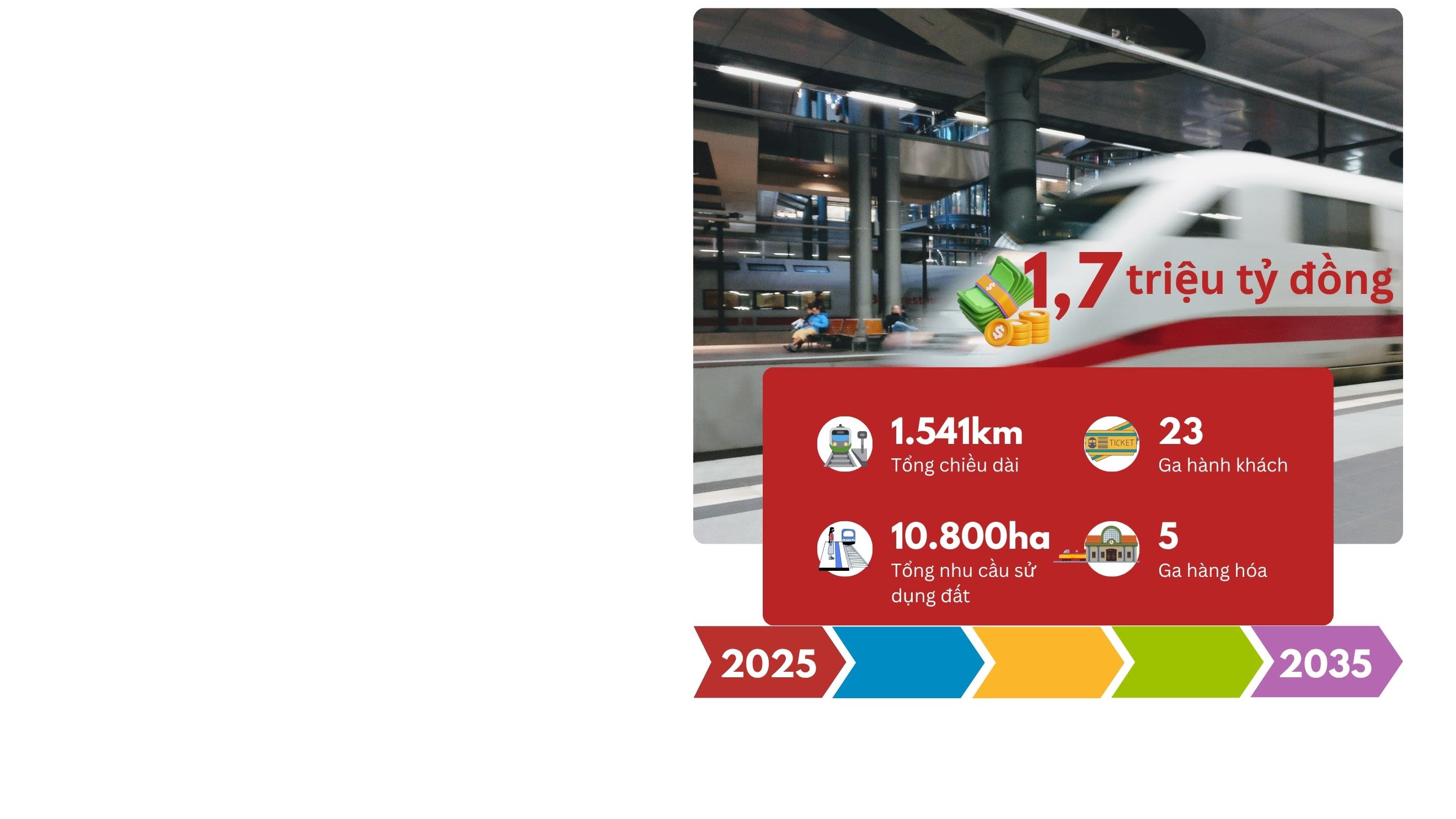 Dự án đường sắt tốc độ cao bắc-nam có tổng chiều dài khoảng 1.541km, điểm đầu tại ga Ngọc Hồi (Hà Nội), điểm cuối tại ga Thủ Thiêm (Thành phố Hồ Chí Minh). Dọc tuyến có 23 ga hành khách và 5 ga hàng hóa. Theo tính toán, sơ bộ tổng nhu cầu sử dụng đất của dự án khoảng 10.800ha. Số dân tái định cư sơ bộ khoảng 120.800 người.