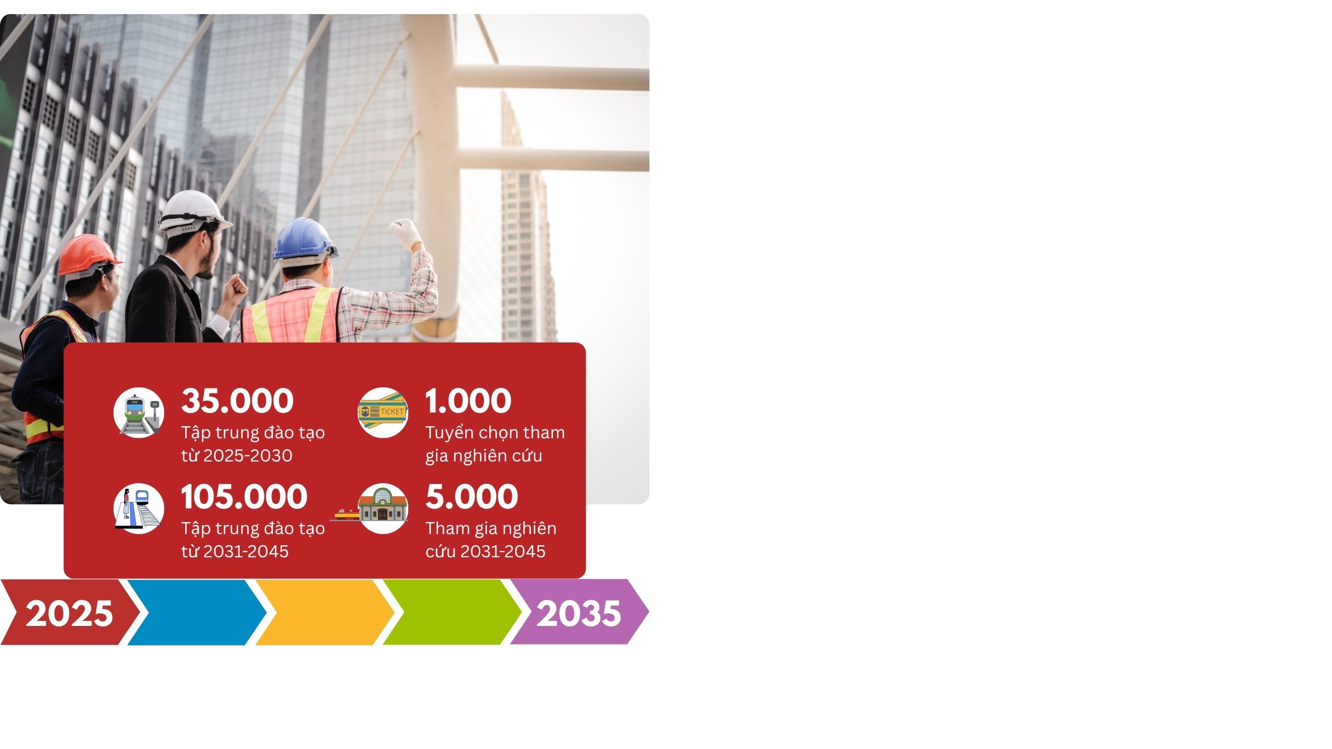 Giai đoạn 2031-2045, sẽ đào tạo ít nhất 105 nghìn nhân lực, tăng cường đào đạo nhân lực chất lượng cao đáp ứng yêu cầu triển khai các dự án và bổ sung nguồn nhân lực giảng dạy cho các cơ sở đào tạo. Đặc biệt, giai đoạn này số lượng nhân lực được tuyển chọn để đào tạo, tham gia trực tiếp vào quá trình nghiên cứu, tiếp nhận chuyển giao, từng bước làm chủ từng phần công nghệ, công nghiệp đường sắt tăng lên là 5.000 người.