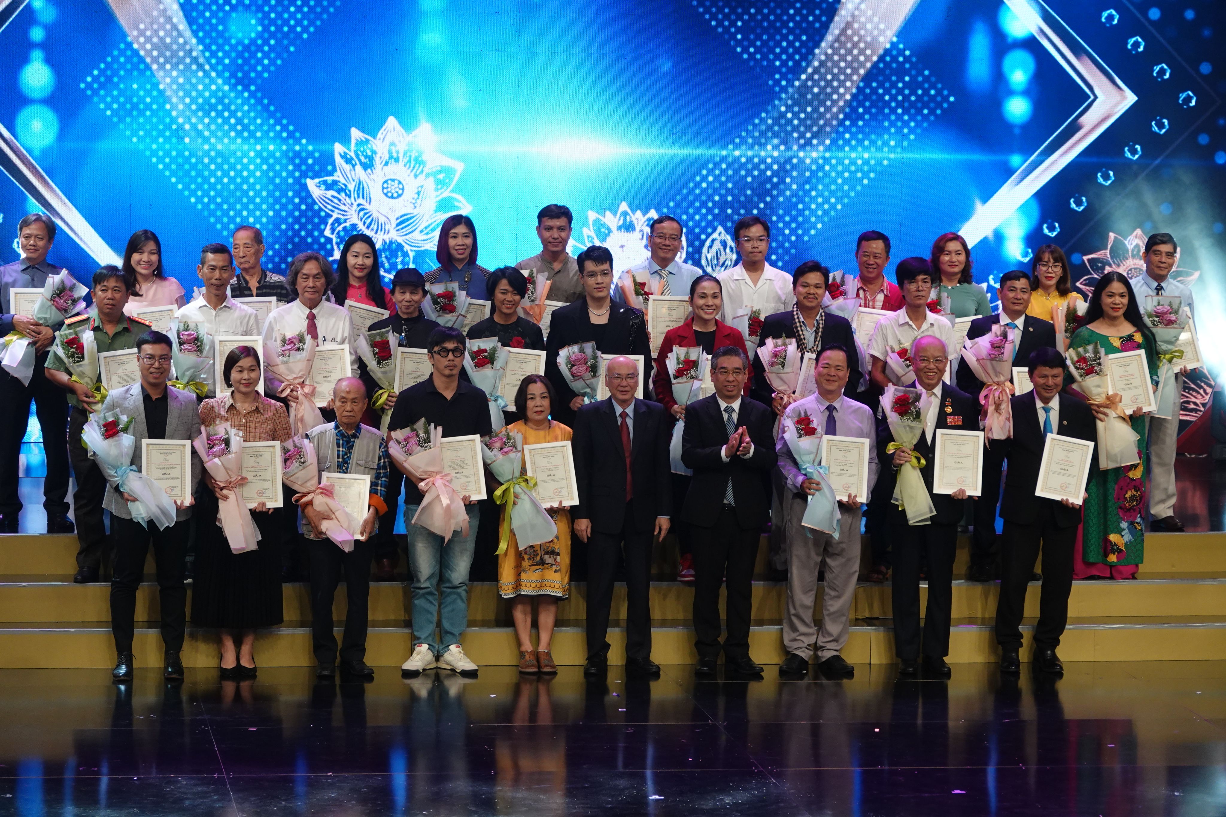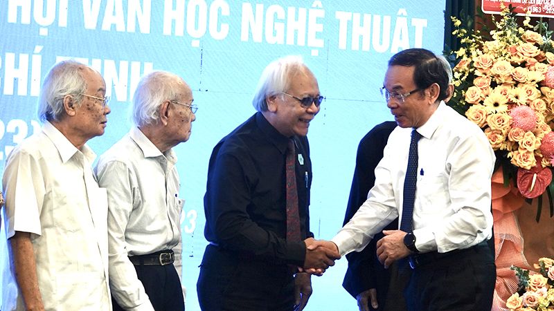 Đồng chí Nguyễn Văn Nên, Ủy viên Bộ Chính trị, Bí thư Thành ủy Thành phố Hồ Chí Minh chúc mừng các văn nghệ sĩ tiêu biểu nhân kỷ niệm 60 năm thành lập Liên hiệp các Hội Văn học Nghệ thuật Thành phố Hồ Chí Minh. Ảnh: Mạnh Hảo